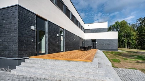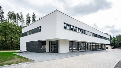 Die Fassade bekam eine klare waagerechte Struktur aus weißen Putzflächen und dem im Erzgebirge typischen Schiefer. „Der Schiefer ist eine Reminiszenz an die regionale Bautradition und ermöglicht eine kontrastreiche Bänderung, die sich mäandermäßig um die Fenster windet“, erläutert IPROconsult-Projektleiter Holger Baalhorn.