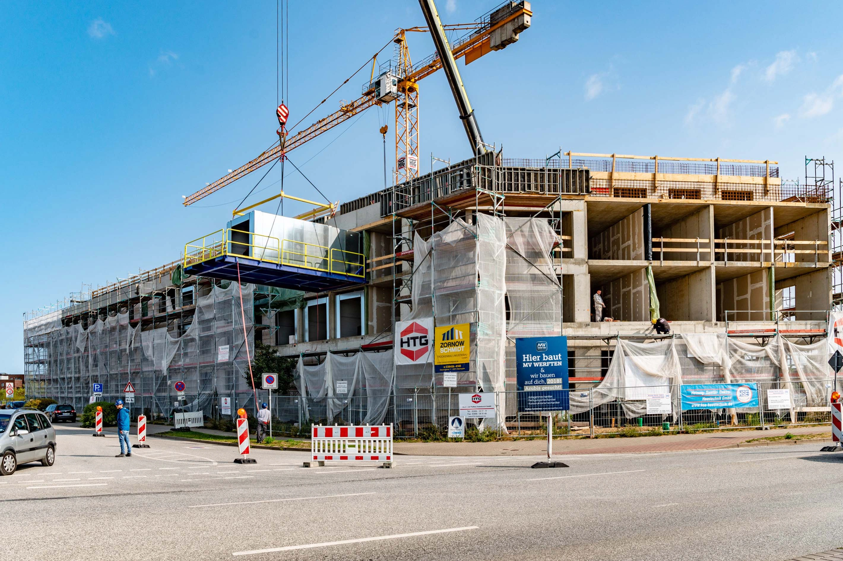 Eine Besonderheit des Gebäudes liegt im Einsatz von vorgefertigten Schiffskabinen, die durch die MV WERFTEN selbst gefertigt werden. Diese Kabinen sind durch die MV WERFTEN von außen in den Rohbau eingeschoben worden. Danach wurde die Fassade durch Fassadenelemente vom GU geschlossen. Die Anschlüsse der Kabinenausbauten an Wände, Decken und Böden wurden durch den Auftraggeber MV WERFTEN ausgeführt. Als Tragwerk kam eine Stahlbeton-Schottenbauweise mit aussteifenden Treppenhauskernen und weiteren Stahlbetonwänden zum Einsatz. Als Gründung wurden Vollverdrängungs-Bohrpfähle mit Pfahlrost und darüberliegender Stahlbetonbodenplatte geplant.