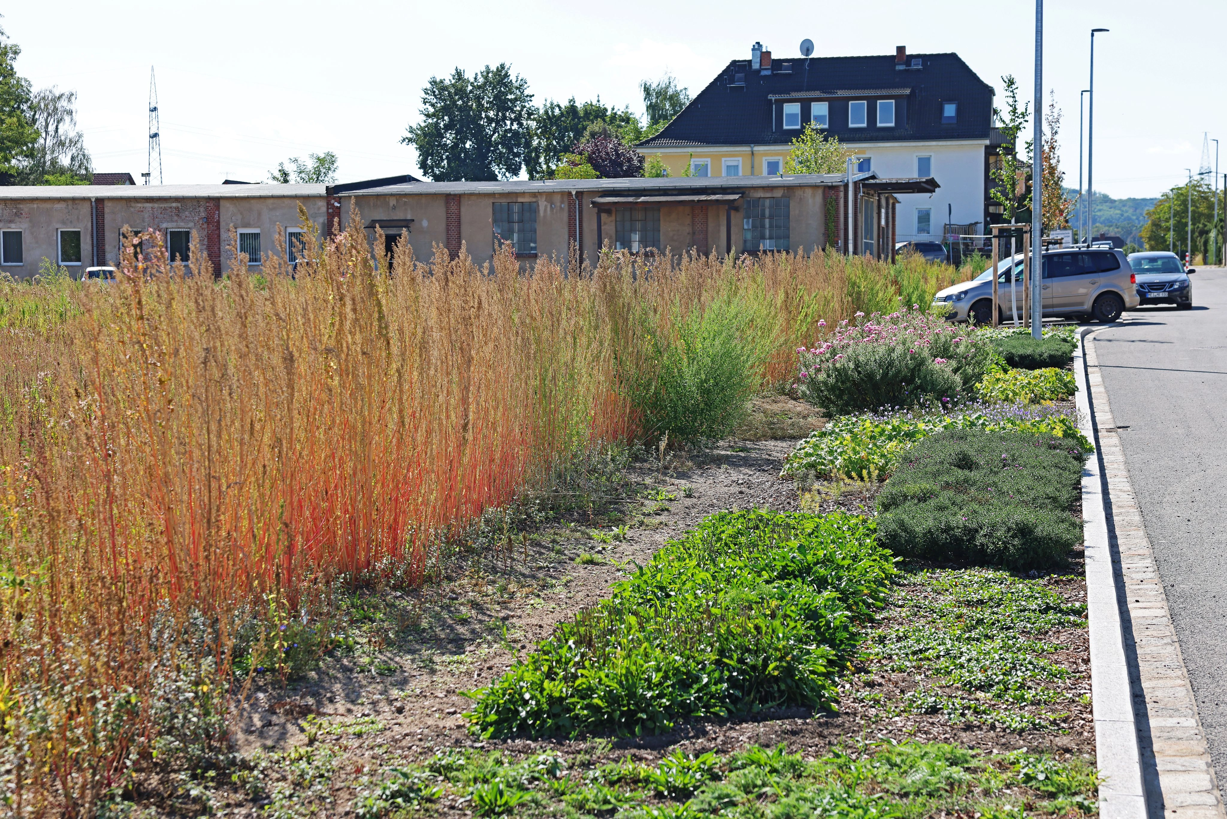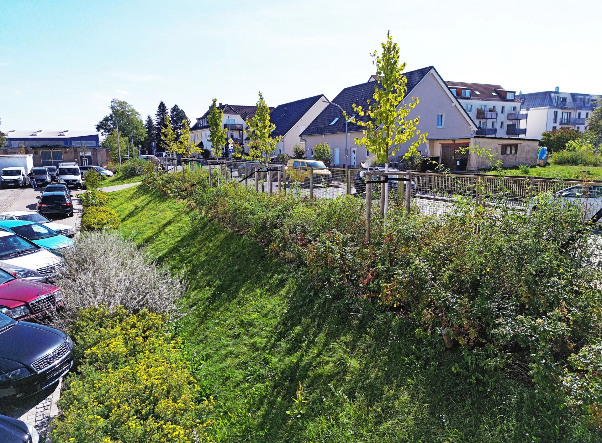 Auch der ehemalige Werksparkplatz wurde entsiegelt und neu gestaltet. Durch eine angepasste Bepflanzung sowie Bodenverbesserungsmaßnahmen sind Bäume und Sträucher künftig besser auf Hitze- und Trockenperioden vorbereitet.