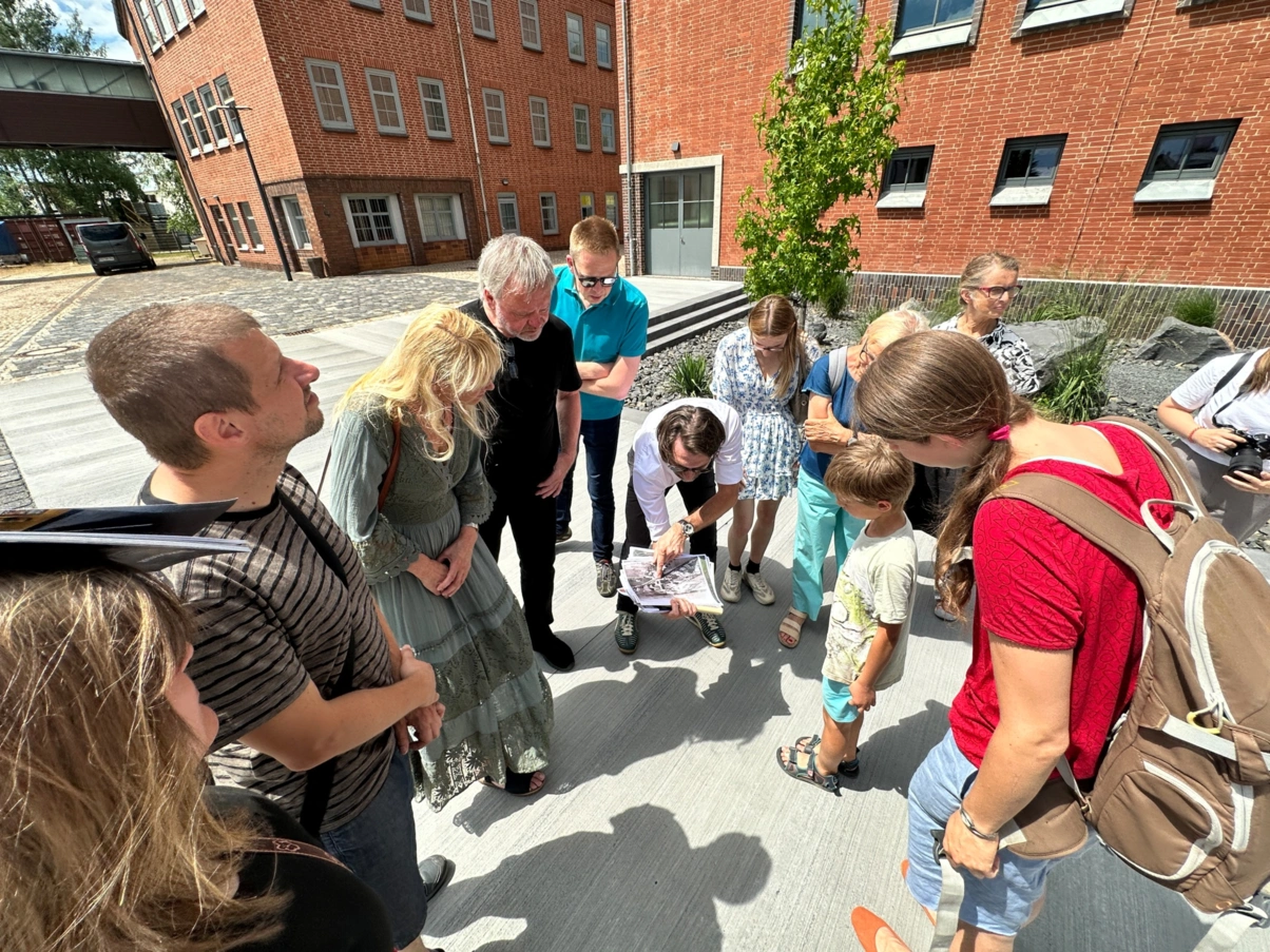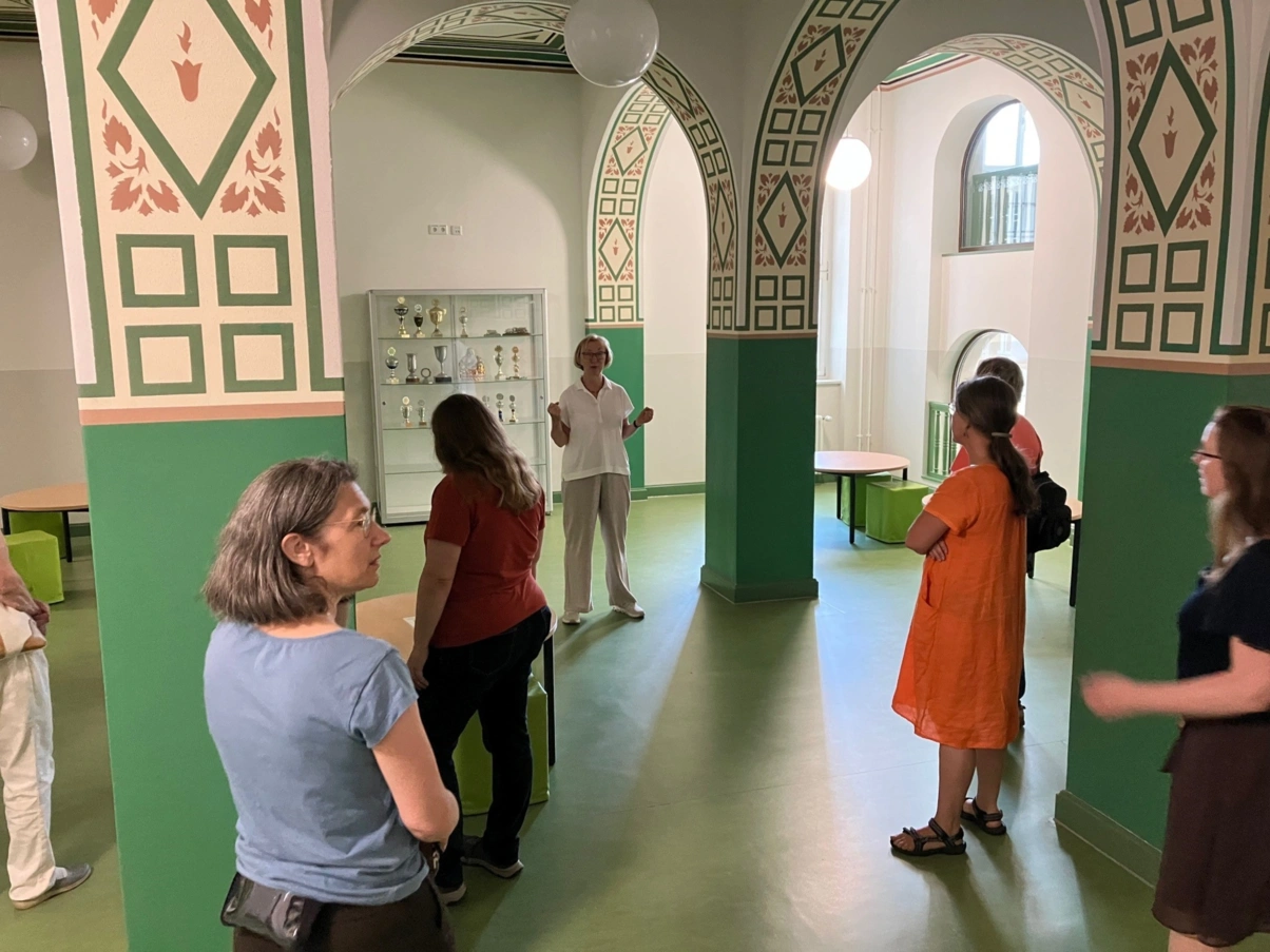 Projektleiterin Sabine Schlicke, Nico Mieth und Bauüberwacher Holger Otto führten in zwei Gruppen durch das gesamte Gebäude – vom Untergeschoss bis in den imposanten, neu geschaffenen Dachraum. Eindrucksvoll war auch die neue Mensa mit integrierter Aula, die früher als Sporthalle genutzt wurde. Holger Otto gab zudem lebendige Einblicke in den Bauverlauf mit vielen Anekdoten, unerwarteten Funden und besonderen Herausforderungen.