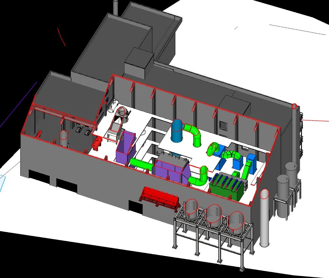 Auf dem leicht abfallenden Gelände entstehen ein Stapelbunker, Trockner, Förderanlagen, eine Verbrennungseinheit mit Rauchgasreinigung sowie ein Betriebs- und Sozialgebäude. Vor Baubeginn müssen bestehende Leitungen verlegt werden. Die Gebäude halten den geforderten Mindestabstand von 100 Metern zur Autobahn A4 ein.