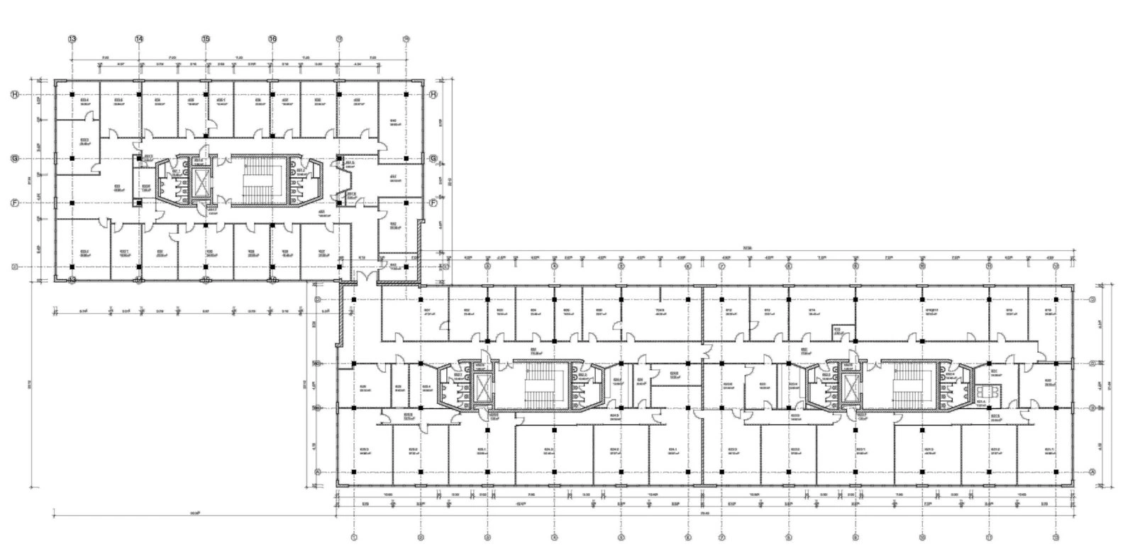 Insgesamt drei identische Gebäudeteile entstanden nach den Plänen der Projektleiter. Schaut man sich den Grundriss an, fällt die eigenwillige Form des jeweils zentralen Gleitkerns auf: Die äußeren Enden sind hier trapezförmig ausgebildet, was aufgrund der Stützenlage statisch notwendig wurde. Die Bauarbeiter unterstellten den Architekten jedoch, dass diese – als Teil des Bau- und Montagekombinat Kohle und Energie – zur Schikane der Arbeiter eine Brikettform entworfen hätten.