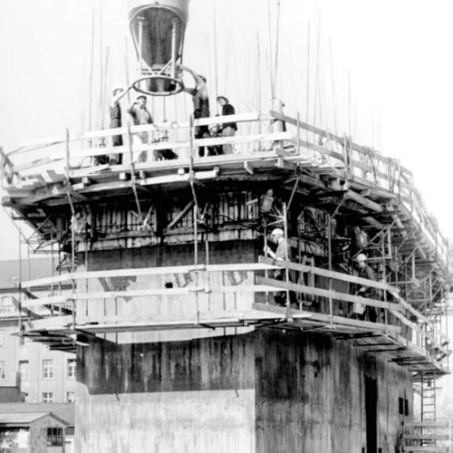 Ziel der Planung war es, ein vom Grundriss flexibles Gebäude zu entwerfen. Die beiden Projektleiter wussten um damals moderne Baumethoden. Zudem hatten sie Kenntnis, dass das BMK über die zuvor erst einmal genutzte komplette Ausrüstung für das in den USA entwickelte ‚Lift-Slab-Verfahren‘ verfügte – und entschieden sich dafür. Bei diesem Hubdeckenverfahren werden die einzelnen Etagendecken am Boden übereinander gegossen: Nach dem Abbinden der ersten bewehrten Betondecke kommt eine Kunststofffolie als Trennschicht, auf der die nächste Decke gegossen wird. Alle sieben Geschossdecken des Bauwerks entstanden so im Paket. Zentraler Fixpunkt des Bauwerks ist dabei der Gleitkern – ein Turm mit Treppenhaus, Fahrstuhl, Versorgungsleitungen und Nassbereichen, wie Toiletten und Küchen. Um ihn herum stehen Stahlstützen in entsprechenden Aussparungen in den Hubdecken. An diesen Doppel-T-Trägern werden die Hubgeräte montiert – je Stütze ein Gerät. Mit vereinter Kraft ziehen sie die Hubdecken nach oben. In ihrer jeweiligen Endstellung wurden diese mittels spezieller Stahlplatten arretiert und anschließend verschweißt.