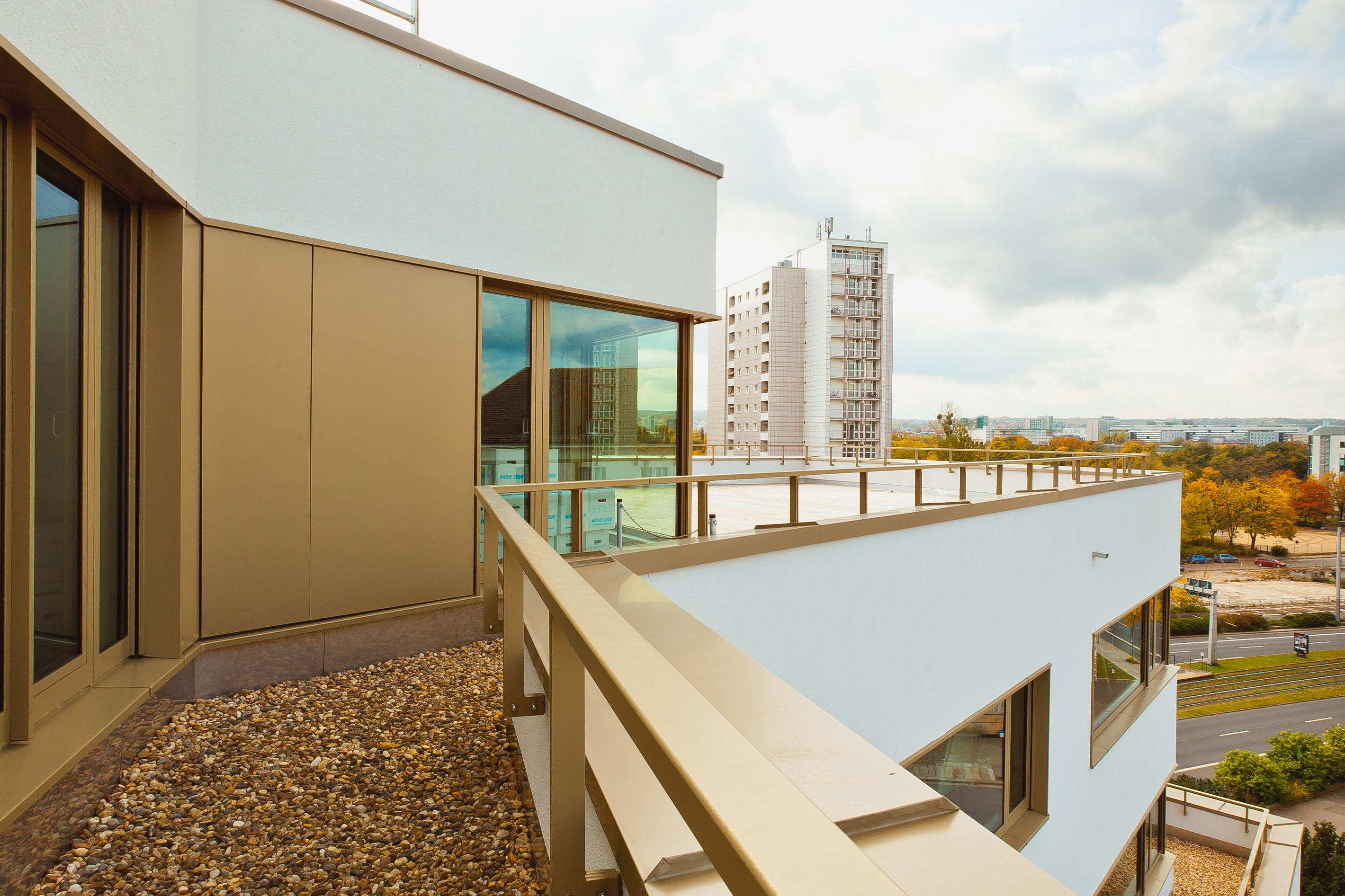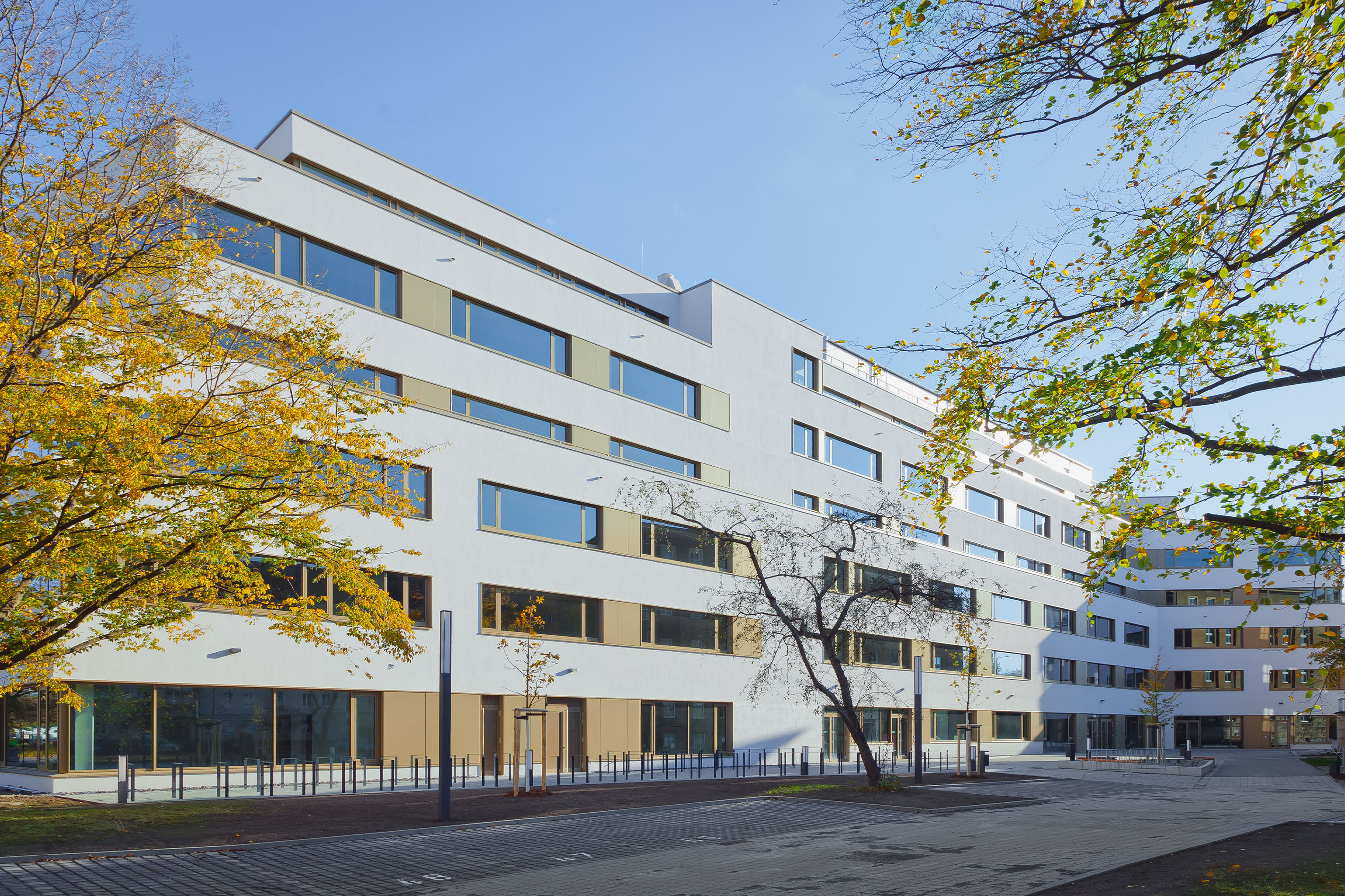 Das neue Gebäude führt drei bisher im Stadtgebiet verteilte Bildungsstätten auf einem gemeinsamen Campus mit Verwaltung, Bibliothek, Fitness und Mensa in zentraler Lage in Dresden zusammen.
