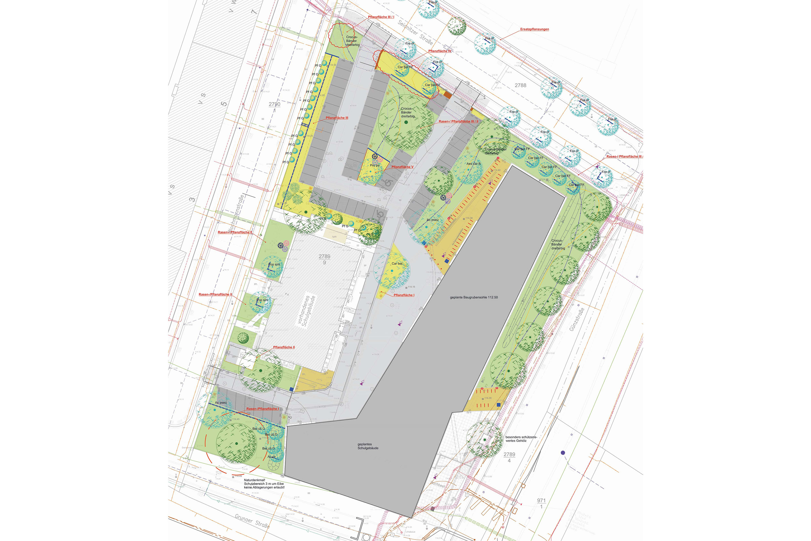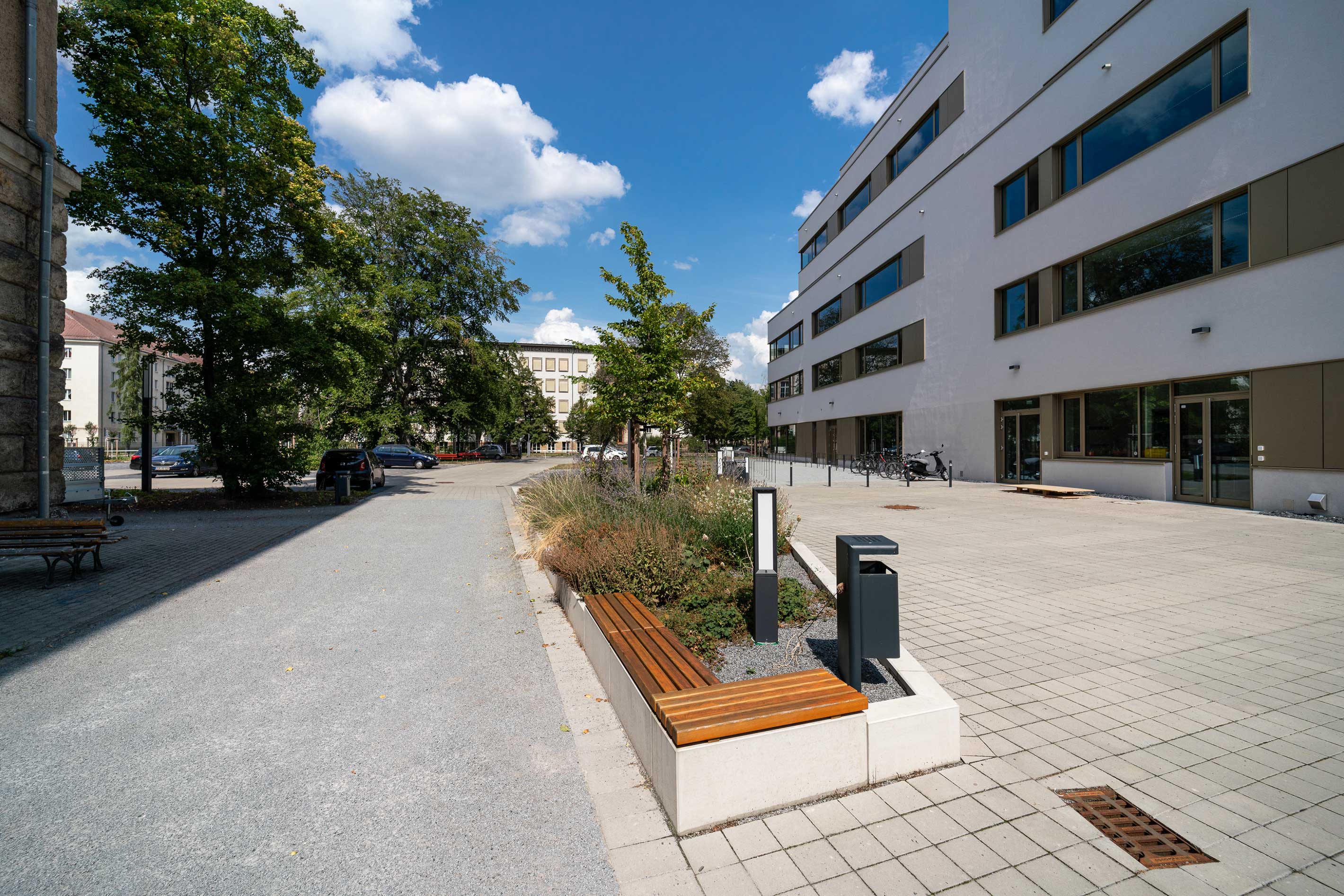 Mit Fertigstellung des Neubaus wurden durch IPROconsult auch die Außenanlagen des Bildungscampus angelegt. Neben Parkplätzen und einer Aufenthaltsfläche mit Ruhezone wurde eine Vielzahl von Grünflächen angelegt, die einen weichen Kontrapunkt zur statischen Architektur setzen. So steht zwischen dem Neu- und dem Bestandsbau eine erhöhte Pflanzinsel mit Stauden und einem schattenspendenden Baum. Über einen Belagswechsel von festen zu weichen Materialien wurden weniger frequentierte von hoch frequentierten Bereichen getrennt.