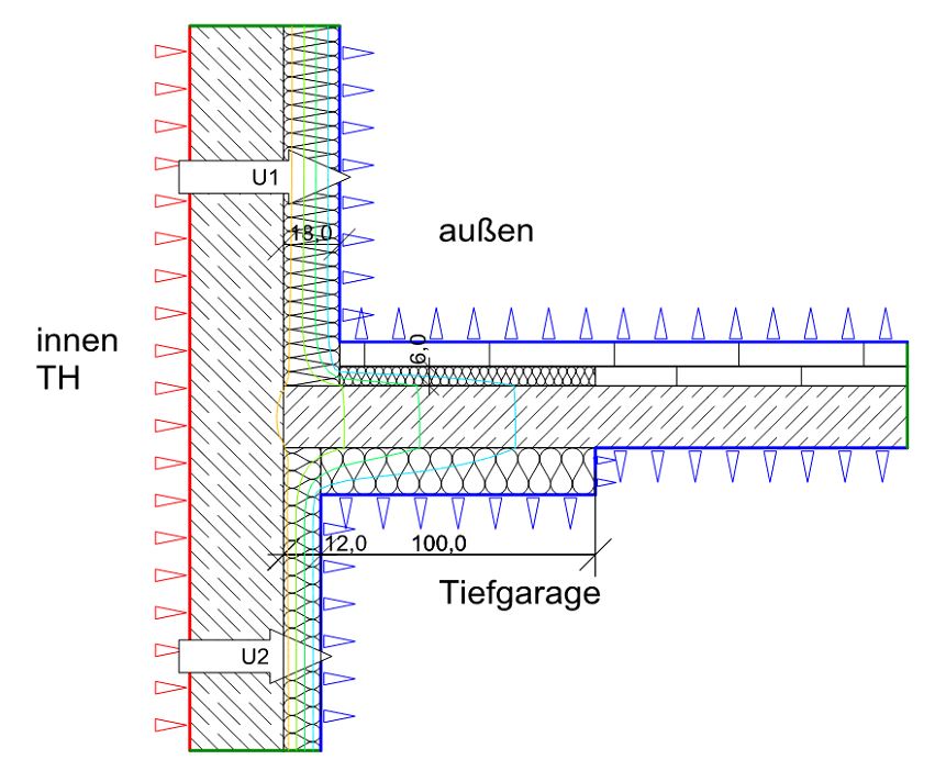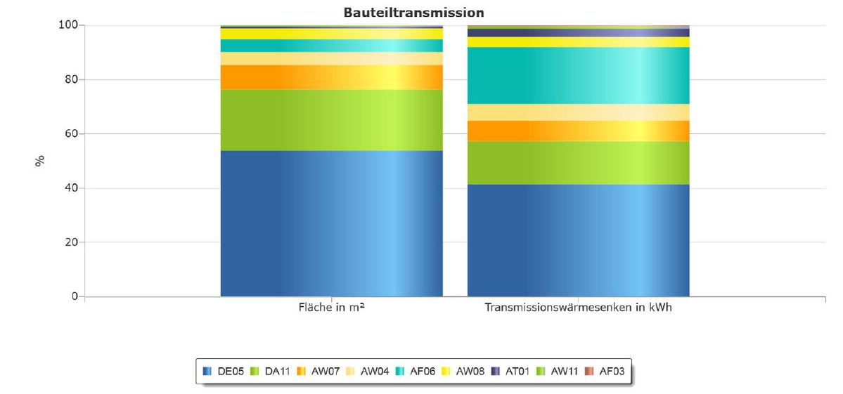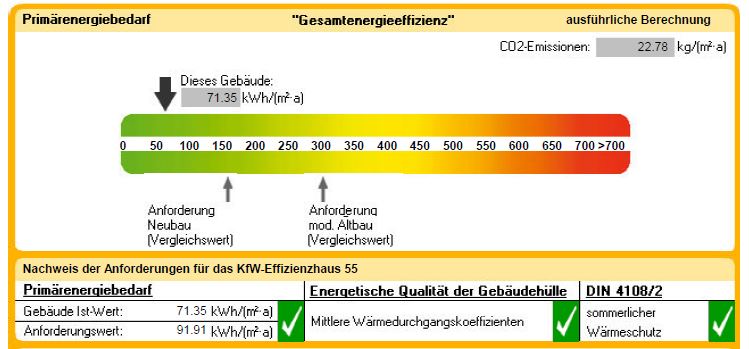 Die KfW definiert ihre KfW-Effizienzgebäude anhand der Unterschreitung des Primärenergiebedarfes und der Transmissionswärmeverluste des Referenzgebäudes, das der GEG-Berechnung zugrunde liegt. Für ein KfW EG 55 muss also der Primärenergiebedarf des geplanten Gebäudes unter 55% des Referenzgebäudes liegen, die Transmissionswärmeverluste bei 70%. Um dies zu erreichen war in diesem Projekt eine erhebliche Verbesserung der Wärmedämmung notwendig. So war ein Sprung von Zweischeiben-Wärmeschutzverglasung auf Dreischeiben-Wärmeschutzverglasung mit einem UW=0,9 W/m²K notwendig, sowie die Verbesserung der Gefälledämmung im Dach von 22 cm WLG 040 auf 26 cm WLG 035 und die Dämmung der Außenwand mit 18 cm Dämmung statt 16 cm. Die Dämmung der Decke zur Tiefgarage wurde von 10 auf 16 cm erhöht. Der pauschale Wärmebrückenzuschlag wurde mit ΔUWB ≤ 0,03 W/m²K angesetzt.