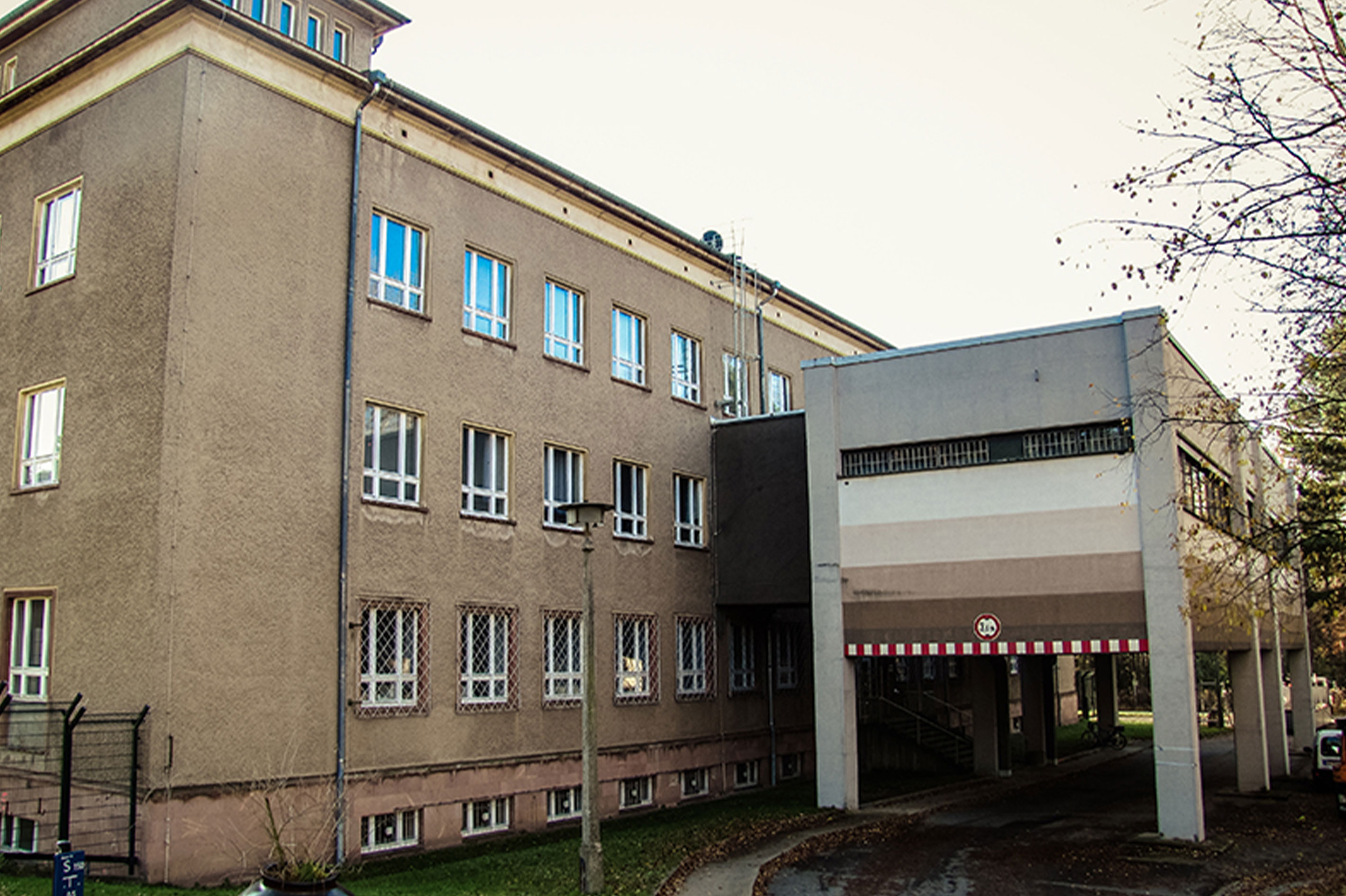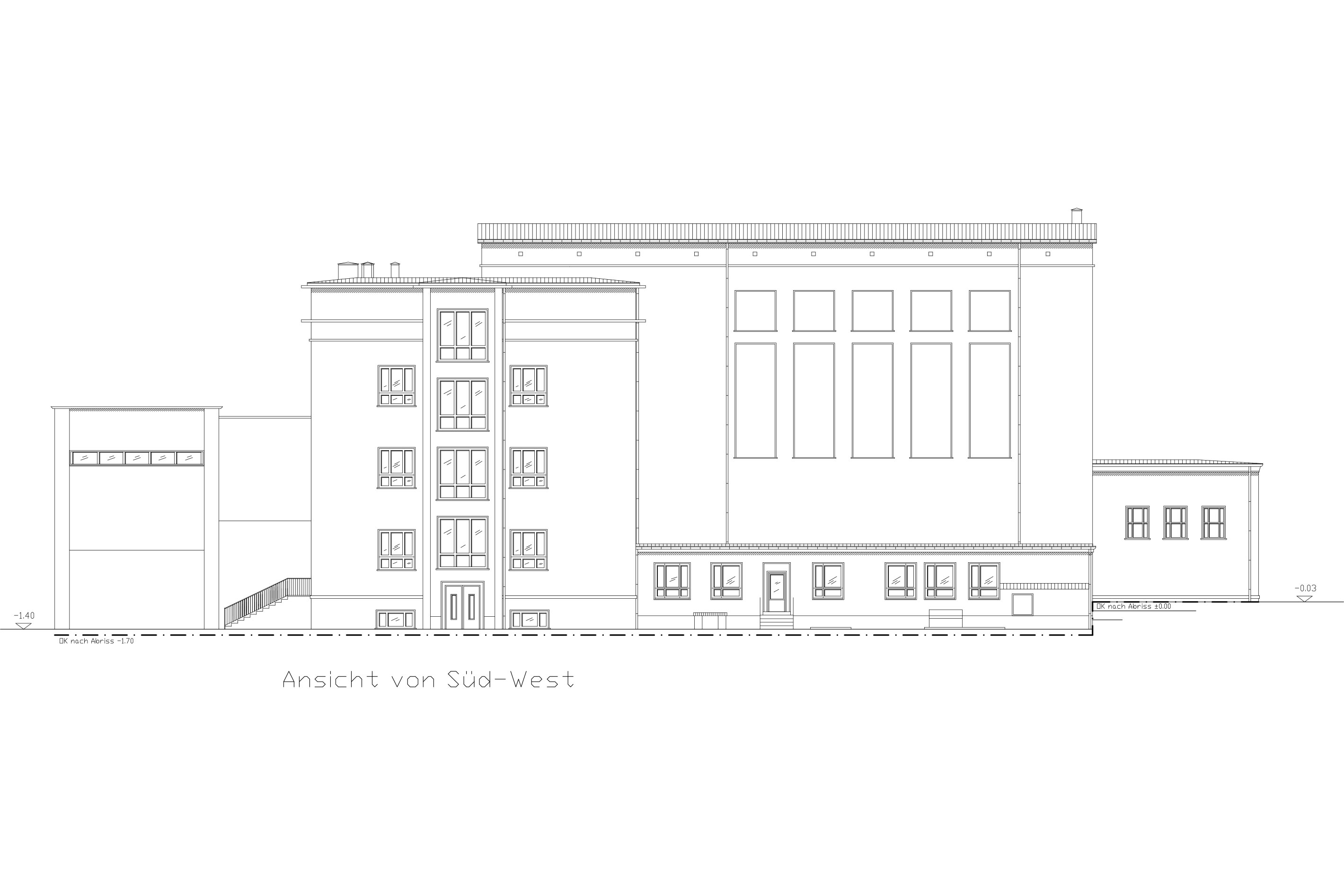 - Kopfbau: 5-geschossig mit Vorbau (aufgeständert eingeschossig)