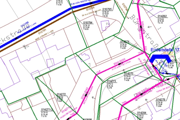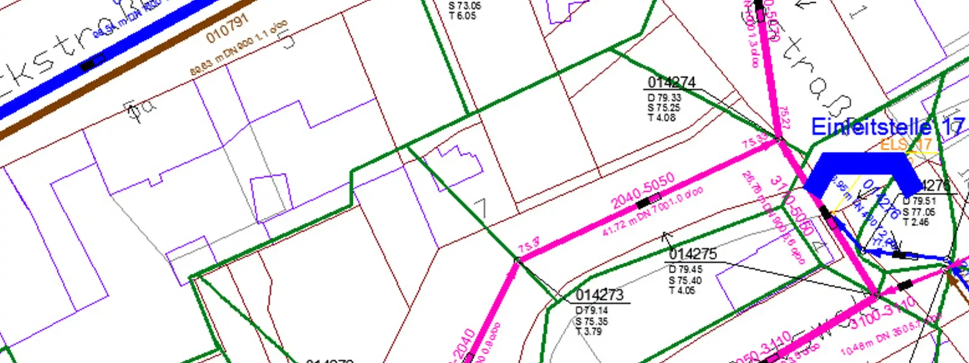 Die Größe des abflusswirksamen Einzugsgebietes beträgt etwa 200 ha, wovon ca. 147 ha befestigte an das Entwässerungssystem angeschlossen sind. Um diese Einzugsgröße für die hydraulischen Berechnungen den Kanalabschnitten bzw. den einzelnen Kanalhaltungen zuzuordnen, mussten etwa 1.000 Einzugsflächen erzeugt und mit ermittelten Eigenschaften (Befestigungsgrad, Trockenwetterabfluss, Neigungsgruppe) genauer definiert werden. Die Befestigungsgrade wurden aus den digital erzeugten befestigten und unbefestigten Flächen auf Basis von Luftbildern, Niederschlagswasser-Kundenlisten und der Allgemeinen Liegenschaftskarte (ALK) generiert und modelltechnisch berechnet. Zur Bestimmung des Trockenwetterabflusses wurden den jeweiligen Haltungen der definierten Teileinzugsgebiete die ermittelten Einwohnerwerte sowie der spezifische Abwasseranfall, modelltechnisch in Form von Einzeleinleitern, zugeordnet. Die Zuordnung der Einwohnerwerte erfolgte dabei längenproportional je Haltung.
