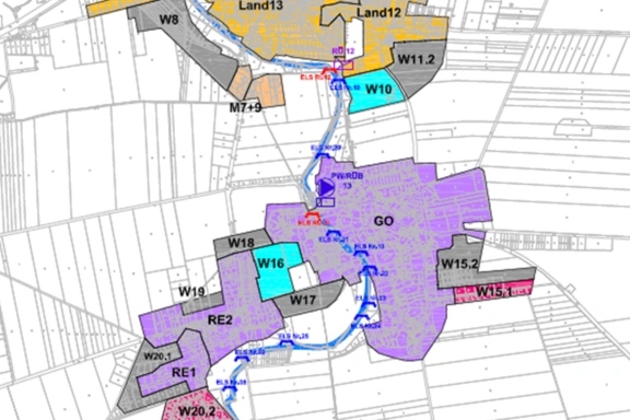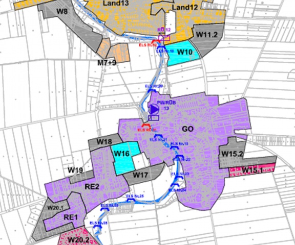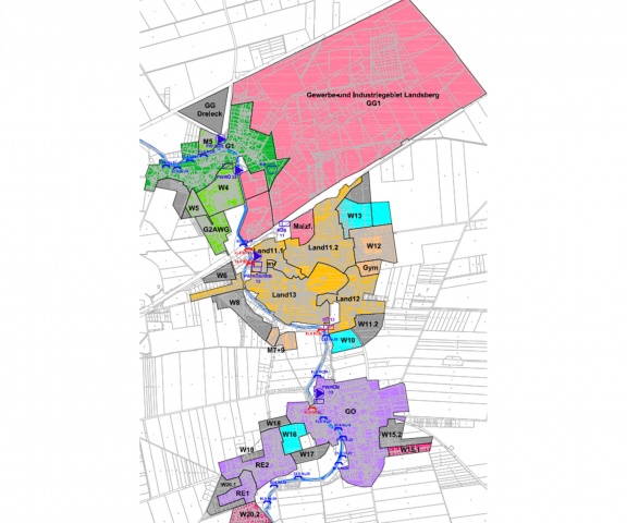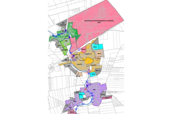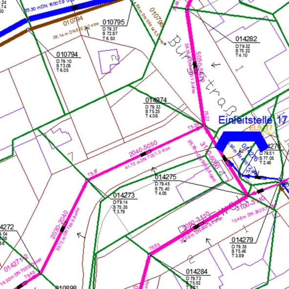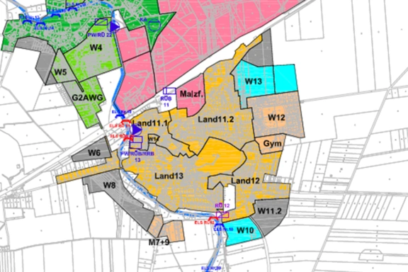 Das Kanalnetz (Mischwassersystem) im Einzugsgebiet der Kläranlage ist ca. 35 km lang. Die Größe des abflusswirksamen Einzugsgebietes beträgt etwa 104 ha, wovon ca. 66 ha befestigte Fläche an das Entwässerungssystem angeschlossen sind. Um diese Einzugsgröße für die hydraulischen Berechnungen den Kanalabschnitten bzw. den einzelnen Kanalhaltungen zuzuordnen, mussten etwa 655 Einzugsflächen erzeugt und mit ermittelten Eigenschaften (Befestigungsgrad, Trockenwetterabfluss, Neigungsgruppe) genauer definiert werden.