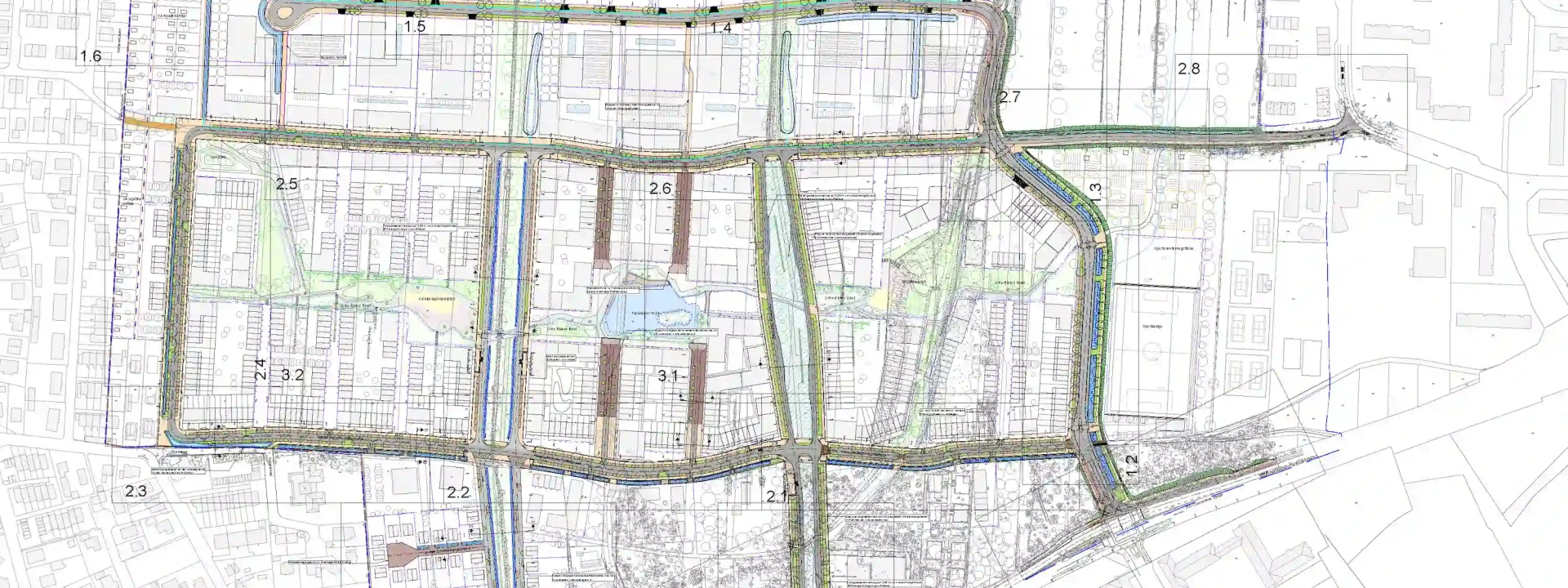 Im Zentrum des Gebietes wird ein Teich angelegt, der insbesondere gestalterische Funktionen hat, entwässerungstechnisch muss jedoch rechnerisch sichergestellt sein, dass auch vor dem Hintergrund der Klimaveränderung das Wasser als gestalterisches Element zur Verfügung steht.