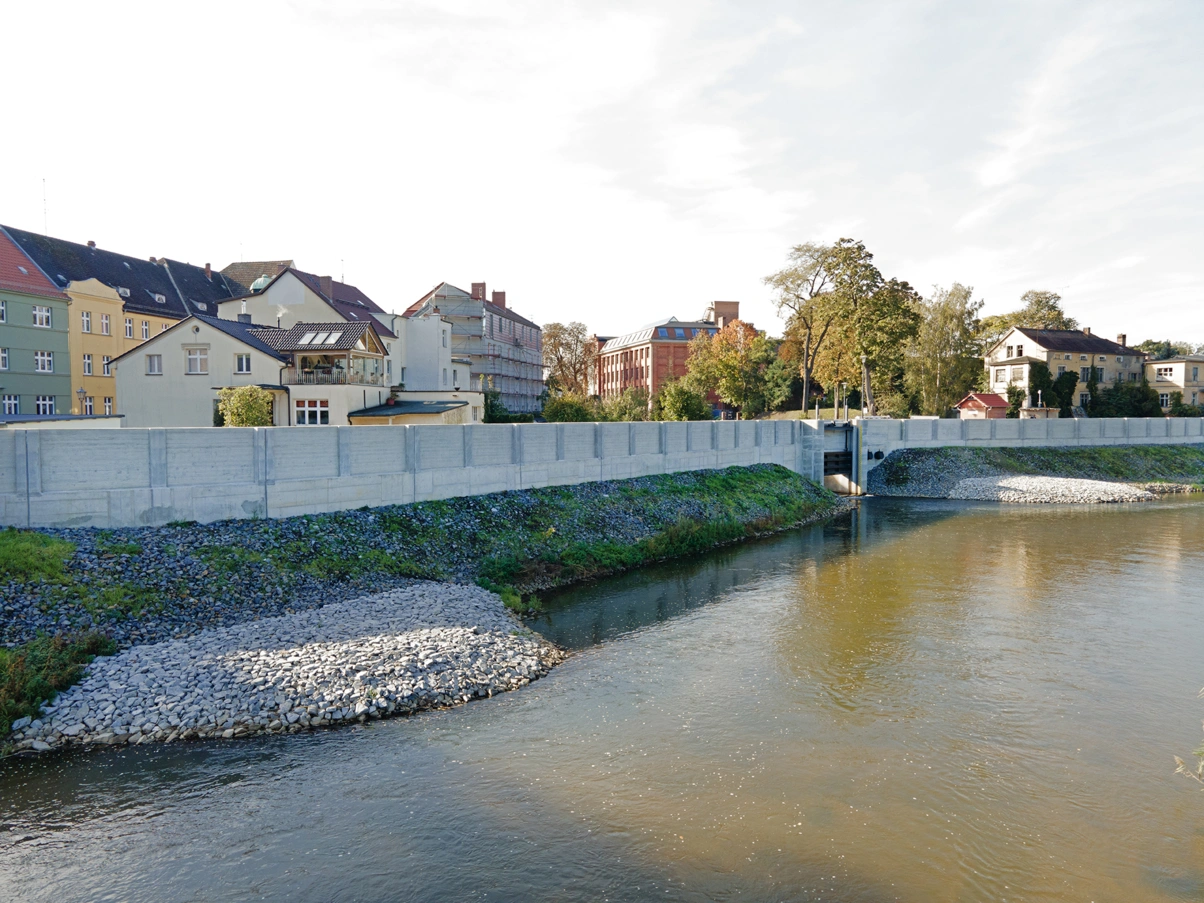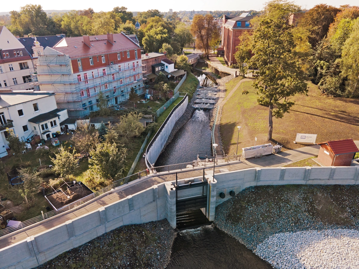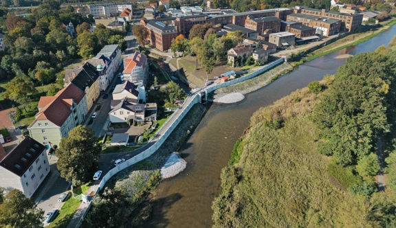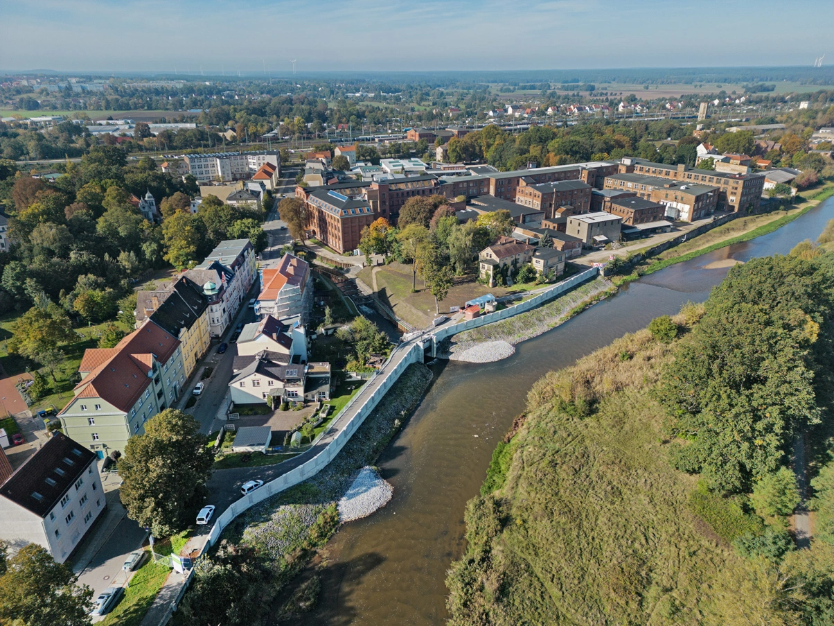 In Guben an der Lausitzer Neiße plante IPROconsult Hochwasserschutzwände und ein Auslaufbauwerk für die einmündende Egelneiße. Dahinter liegen mehrere denkmalgeschützte Villen, Mietshäuser und eine ehemalige Hutfabrik mit einer heute spannenden Nutzung.