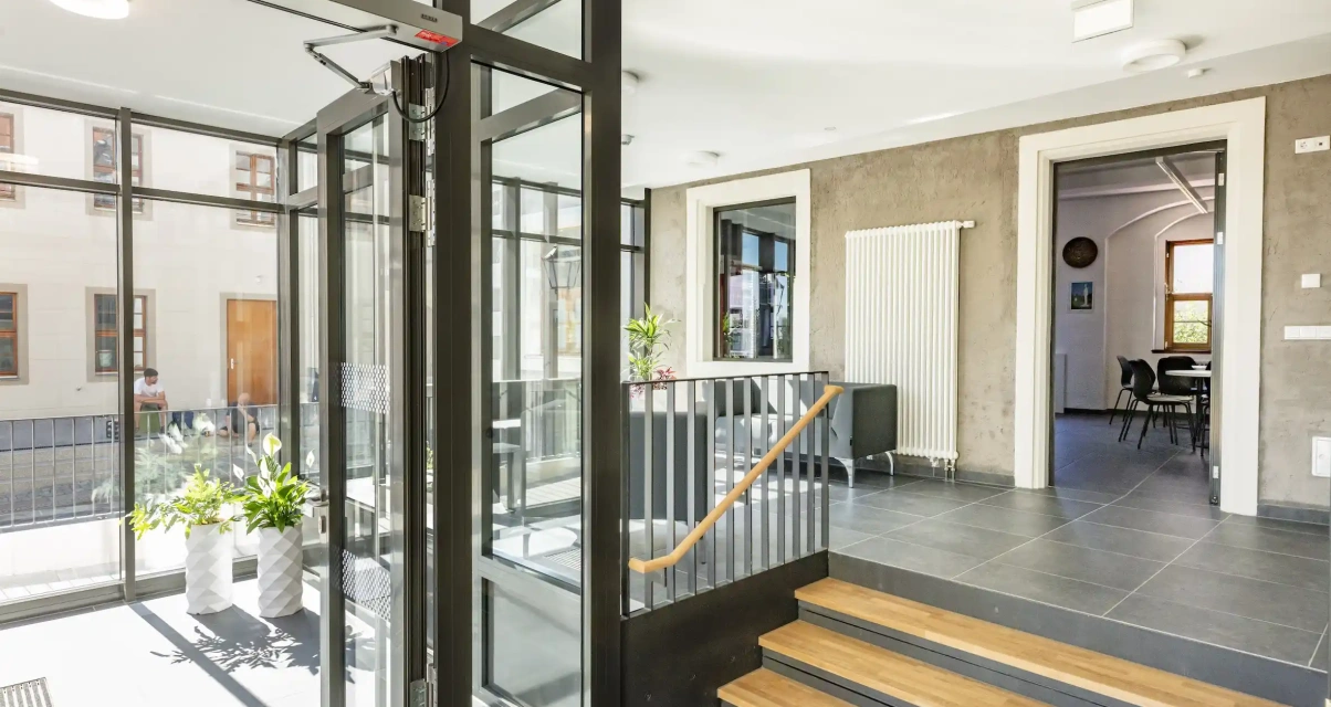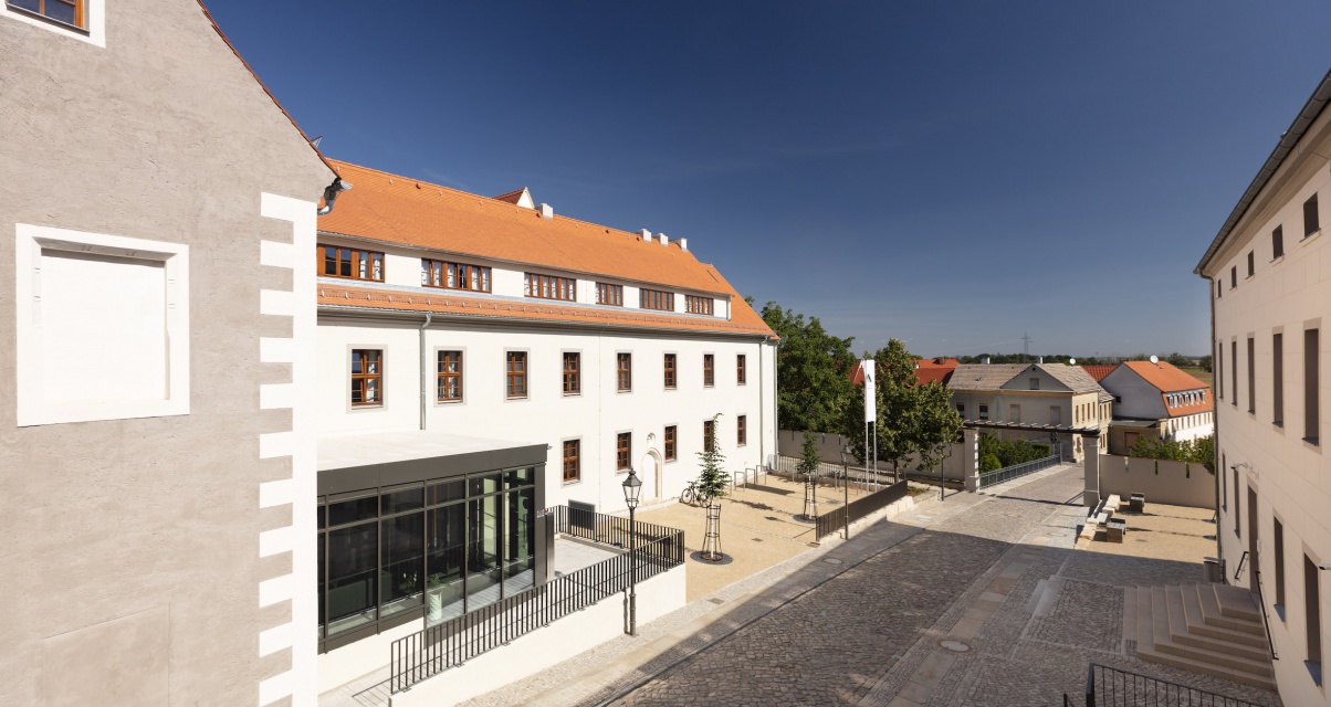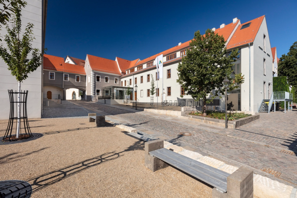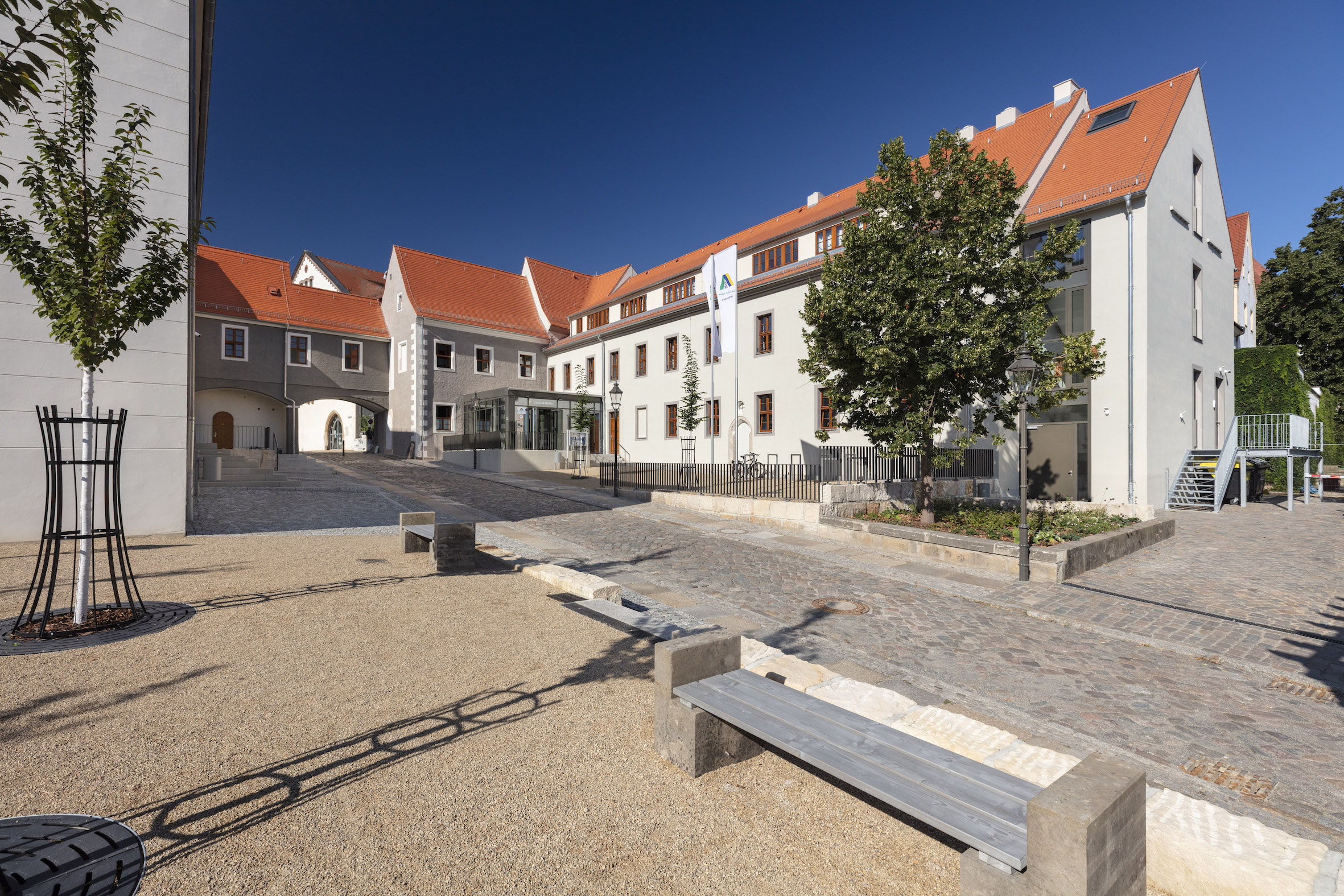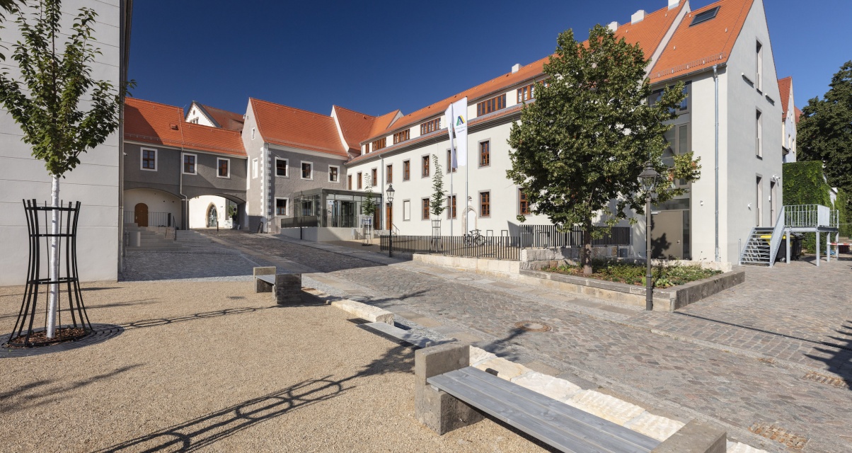 Zum gelungenen Eindruck tragen auch die Außenanlagen bei, mit deren Planung IPROconsult ebenfalls betraut war. Das denkmalschutzgeprägte Areal wurde so umgestaltet, dass die Zugänge weitestgehend barrierefrei erfolgen. Dafür planten die Ingenieure eine Rampe und Treppen in den Eingangsbereichen mit Stützmauern aus Sandsteinblöcken. Dabei kamen die vorhandenen Materialien nach Möglichkeit wieder zum Einsatz. Punktuell wurden Mauern in anderer Bauweise wiedererrichtet, um den historischen Charakter der Anlage zu unterstreichen. Ebenso fanden die zuvor rückgebauten Banksockel mit einer neuen Sitzauflage einen neuen Standort auf dem Gelände. Weiterhin werden Fahrradständer und Fahnenmaste sowie Leuchten in Anlehnung an den historischen Bestand in der Umgebung aufgestellt.