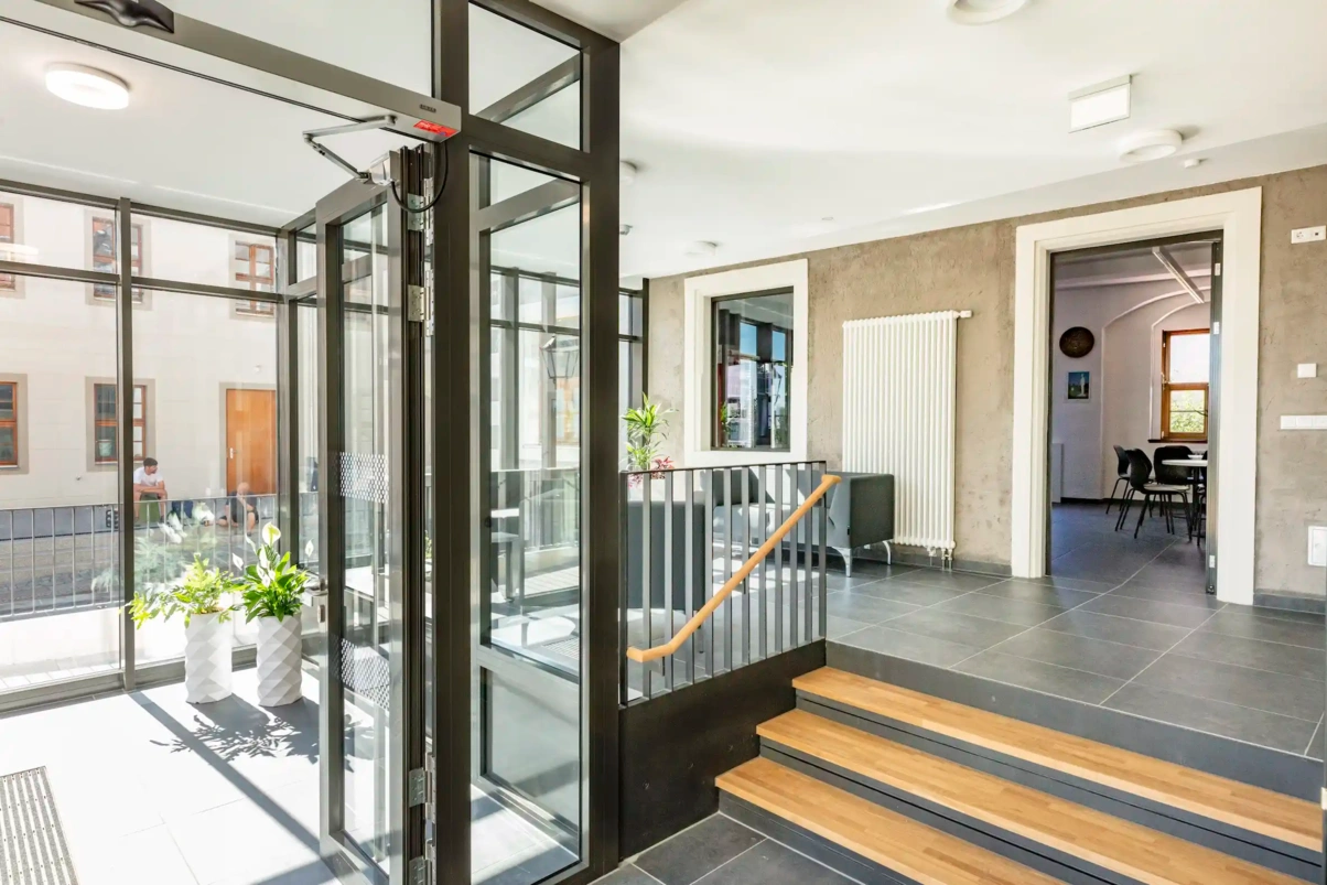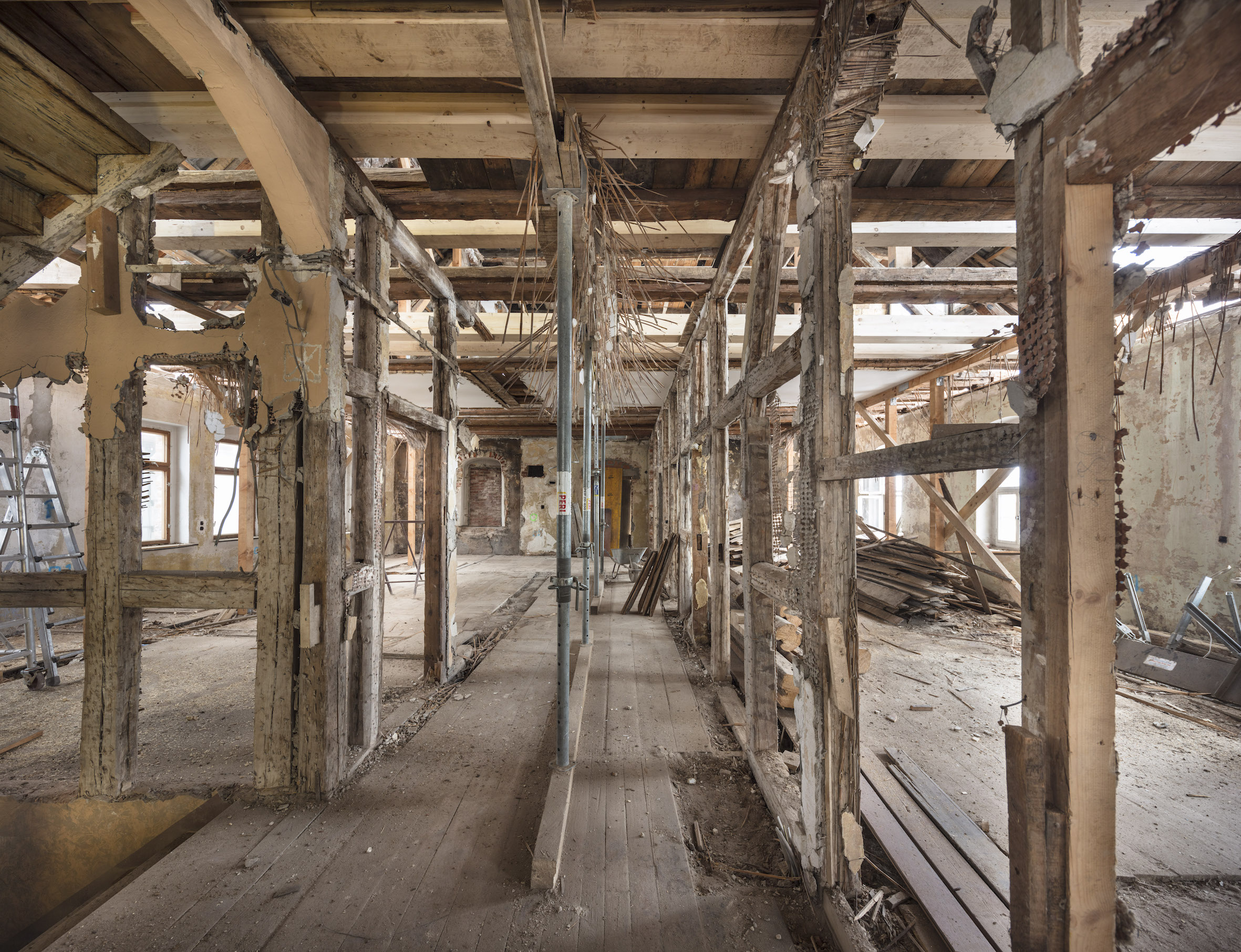 Die im Nordflügel befindliche Treppe wurde durch ein neues Fluchttreppenhaus ersetzt.
