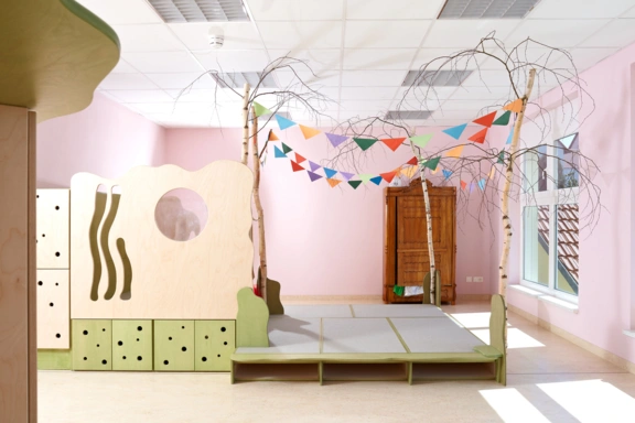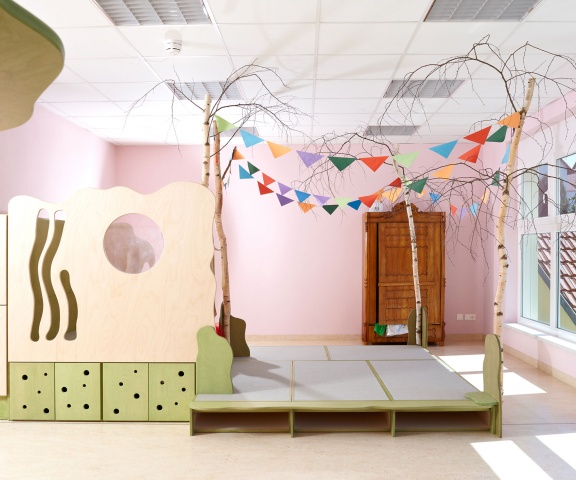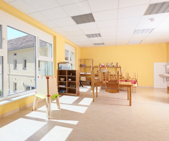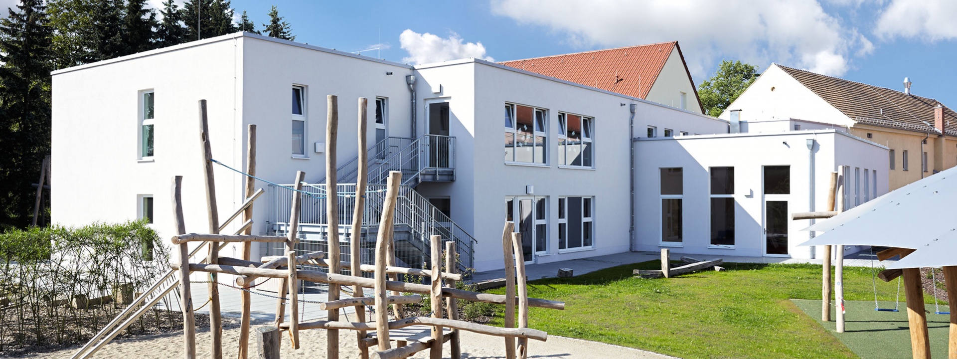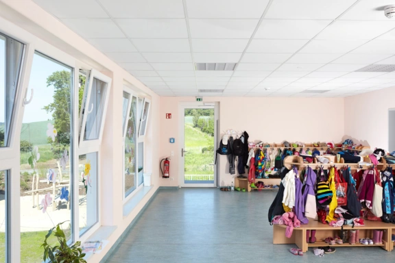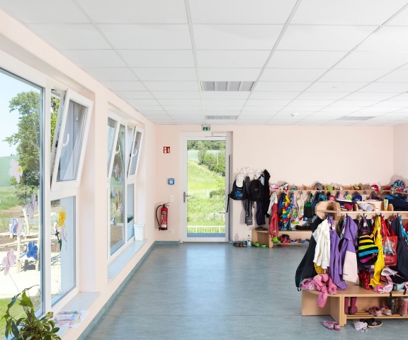 Der Eingang zur Kindertagesstätte wurde an der Verbindungsstelle zwischen Alt- und Neubau angeordnet. Vom Foyer aus sind auf kurzem Wege die Flure zu den Kindergruppen, der Mehrzweckraum, der Treppenraum zum Obergeschoss, ein Behinderten- und Gäste-WC und das Haupthaus zu erreichen. Die Spiel- und Aktionsflächen im Außenbereich befinden sich im geschützten Winkel des L-förmigen Baukörpers und im rückwärtigen Gartenbereich.