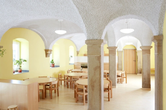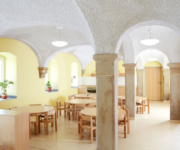 Im Haupthaus des Dreiseithofes finden allgemeine Funktionen wie Ausgabeküche, Speiseraum, Kinderküche und Lager im Erdgeschoss, Personalraum und Büro im Obergeschoss ihren Platz.