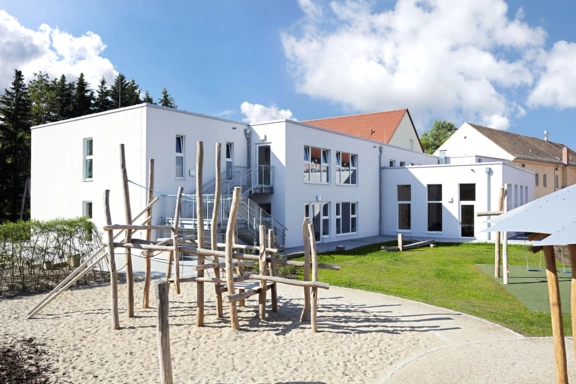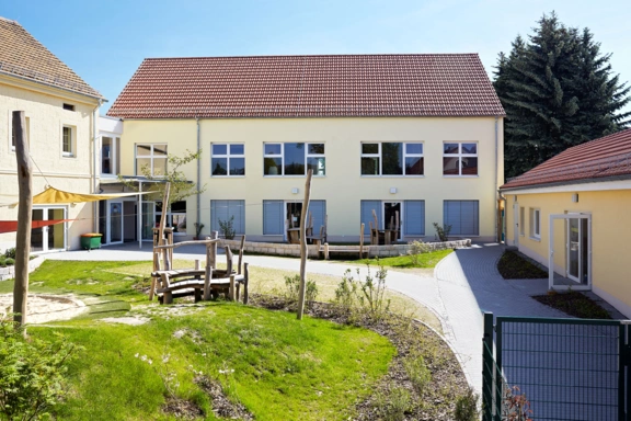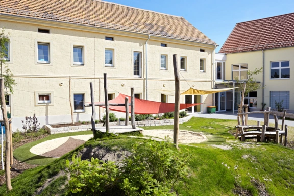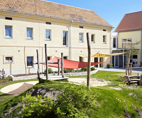 Die Kindereinrichtung ist auf dem Grundstück eines ehemaligen Dreiseithofes, bestehend aus einem zweigeschossigen Haupthaus, einer Scheune und einem eingeschossigen Nebengebäuden, entstanden.
