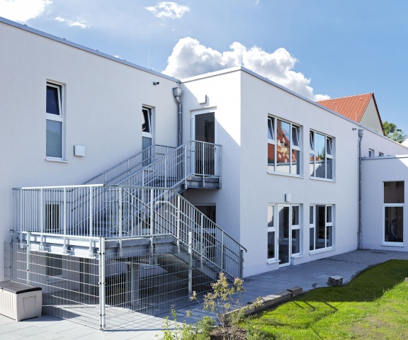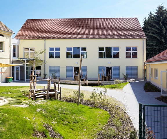 Von der Hauptstraße zurückgesetzt wird der Gebäudekomplex über den Hof erschlossen. Die Scheune wurde abgebrochen. An deren Stelle ist ein L-förmiger Neubau mit zwei Geschossen entstanden, der die Gruppen-, Schlaf- und Sanitärräume für die Kinderkrippe und den Kindergartenbereich sowie einen Mehrzweckraum beinhaltet.