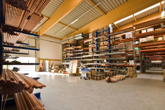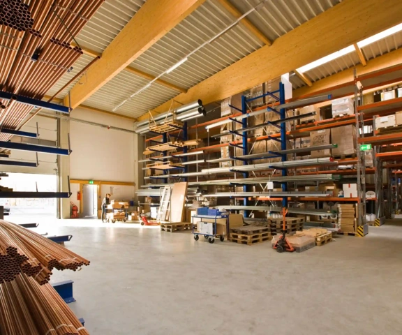 Im Rücken der Anlage befindet sich die Lagerhalle, die mit ca. 8 m Traufhöhe beginnend, schräg bis zum Konferenzgeschoss ansteigt und dessen Dachfläche, zusammen mit der des Ausstellungsgebäudes ein großflächiges Pultdach bildet.