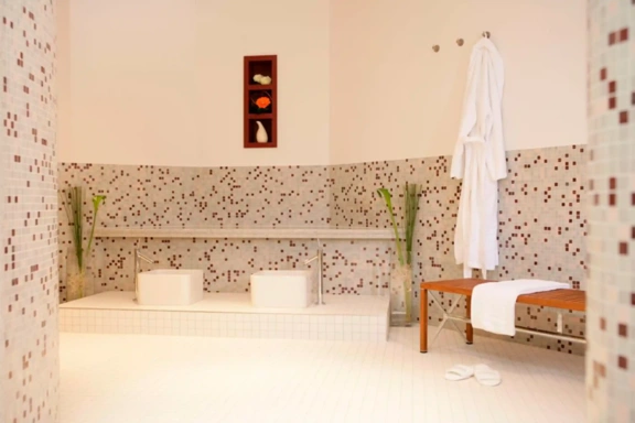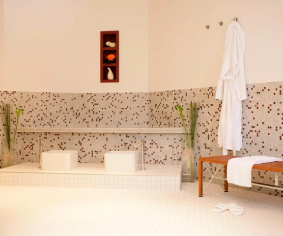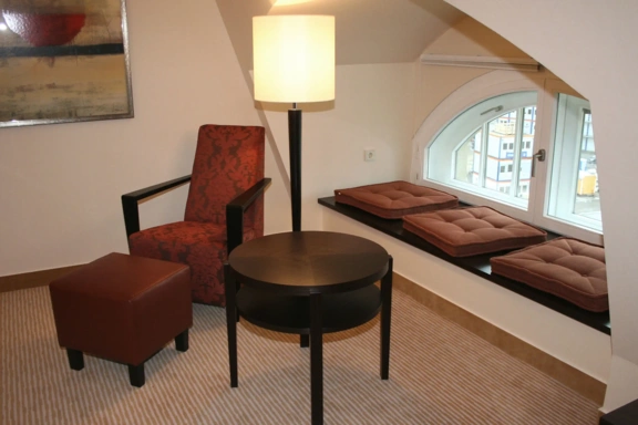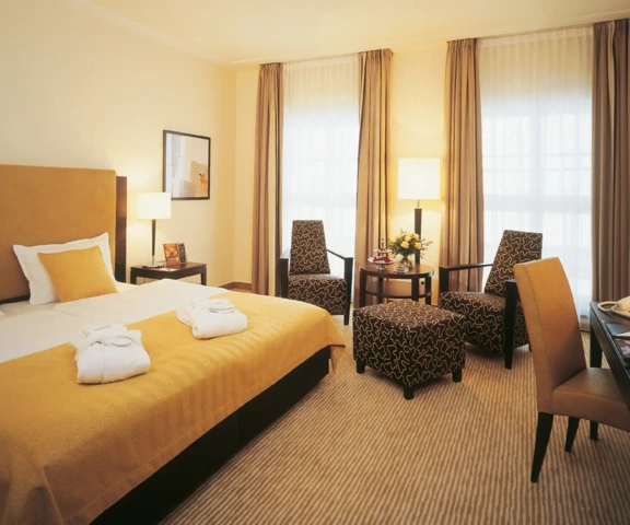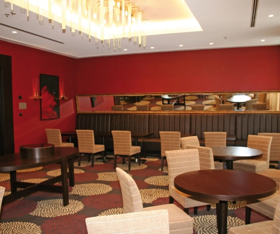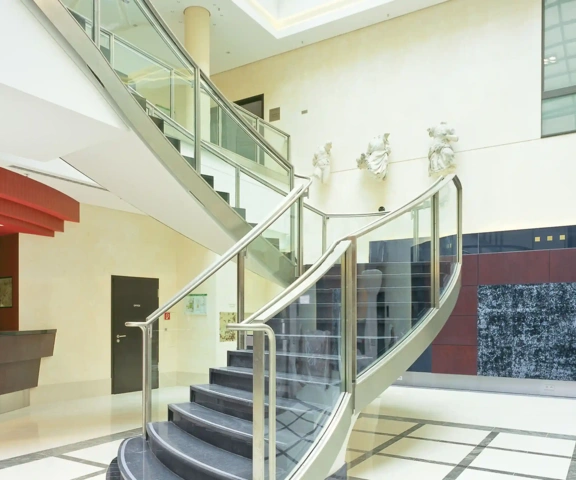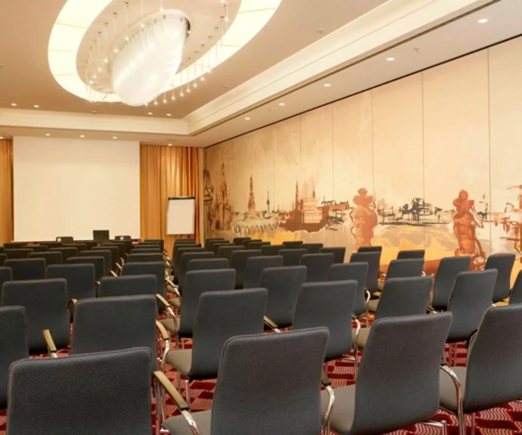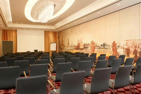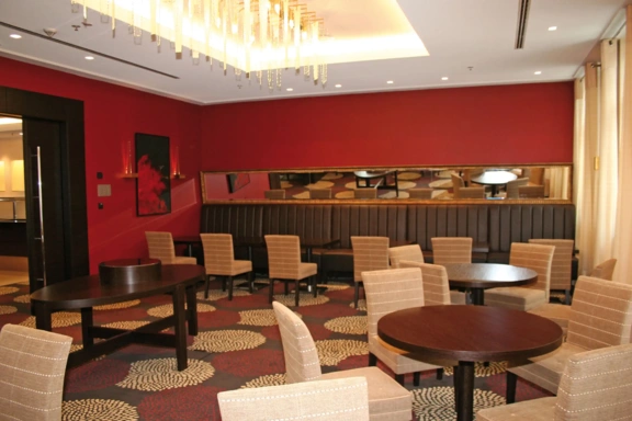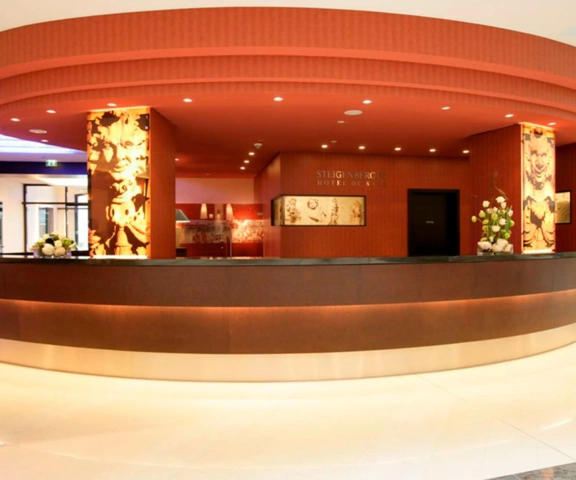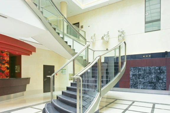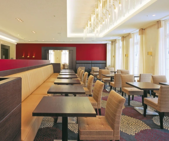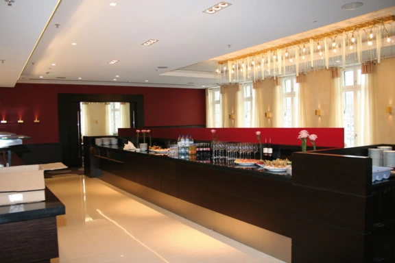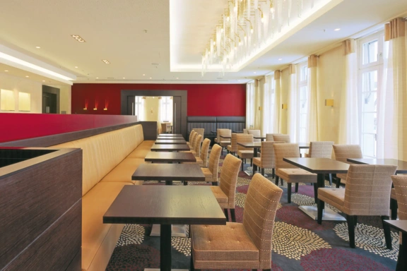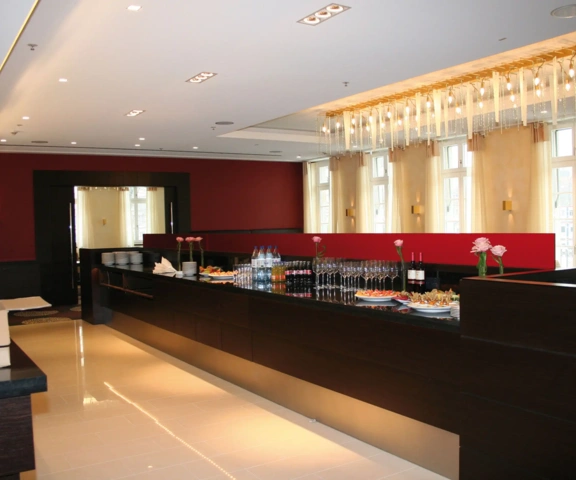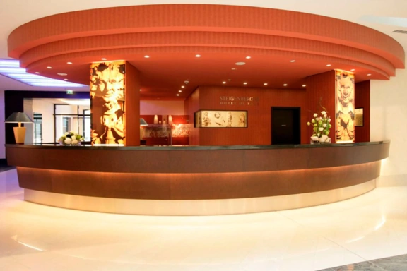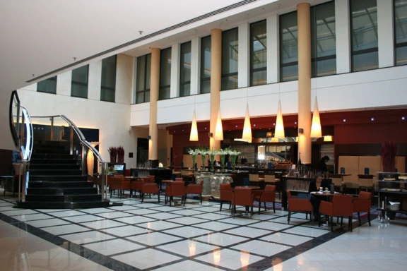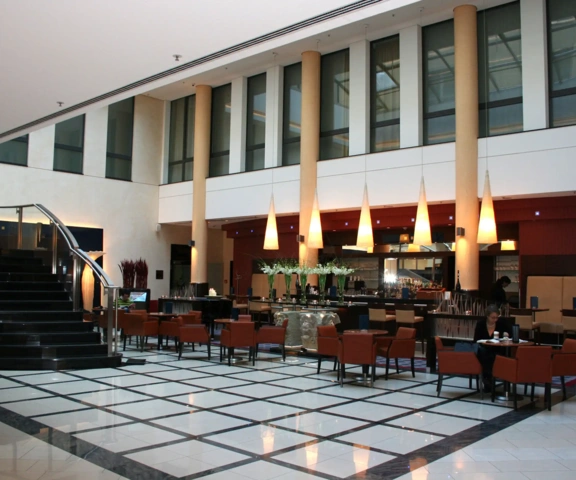 Im Erdgeschoss befinden sich Hotel-Empfang und Lobby und direkt neben der Lobby ein Festsaal. Dieser gesamte Bereich erhält seine gestalterische Bedeutung durch den glasüberdachten Innenhof.