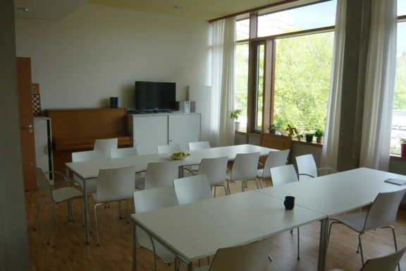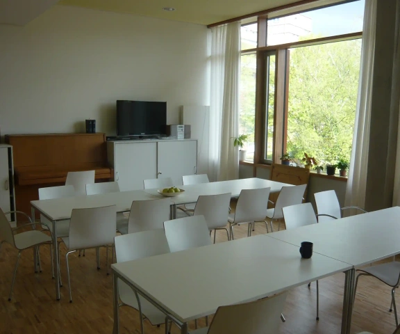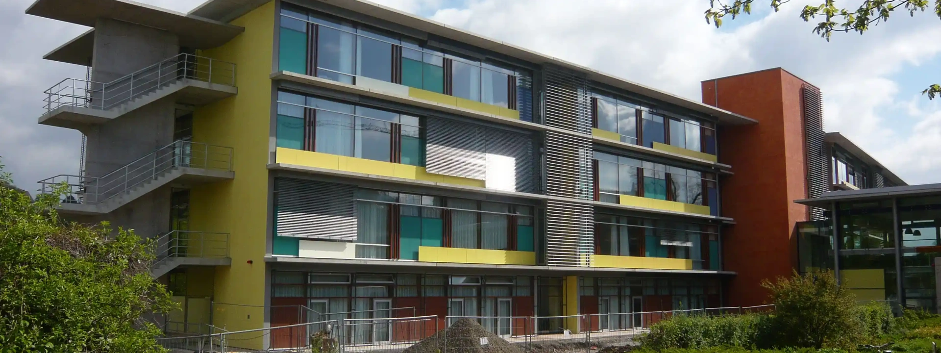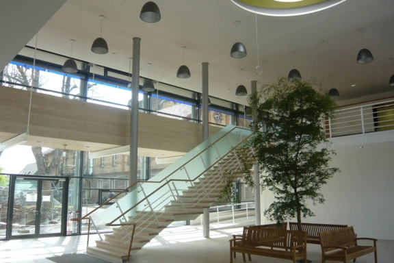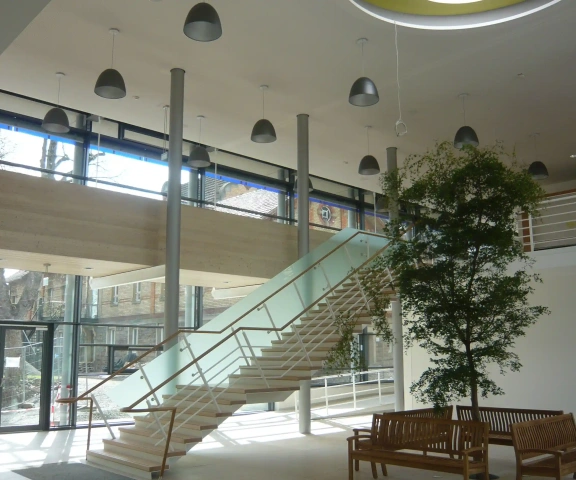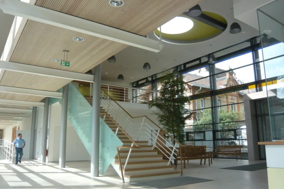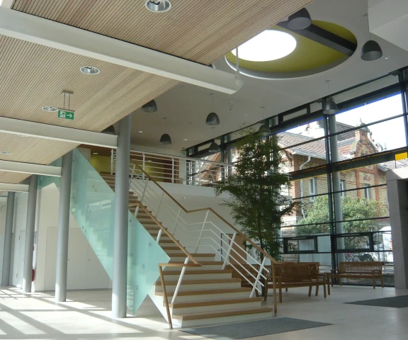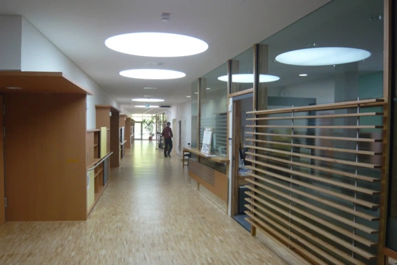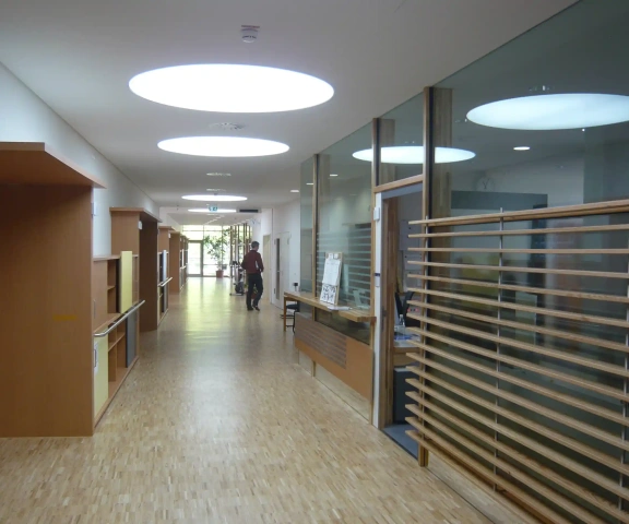 Der zweigeschossige Galerieraum ist der neue Haupteingang, hier sind gleichzeitig Hörsaal und Cafeteria untergebracht. Der Neubau verbindet den zweiflügligen Bettenbau im Norden mit dem südlich gelegenen Altbau.