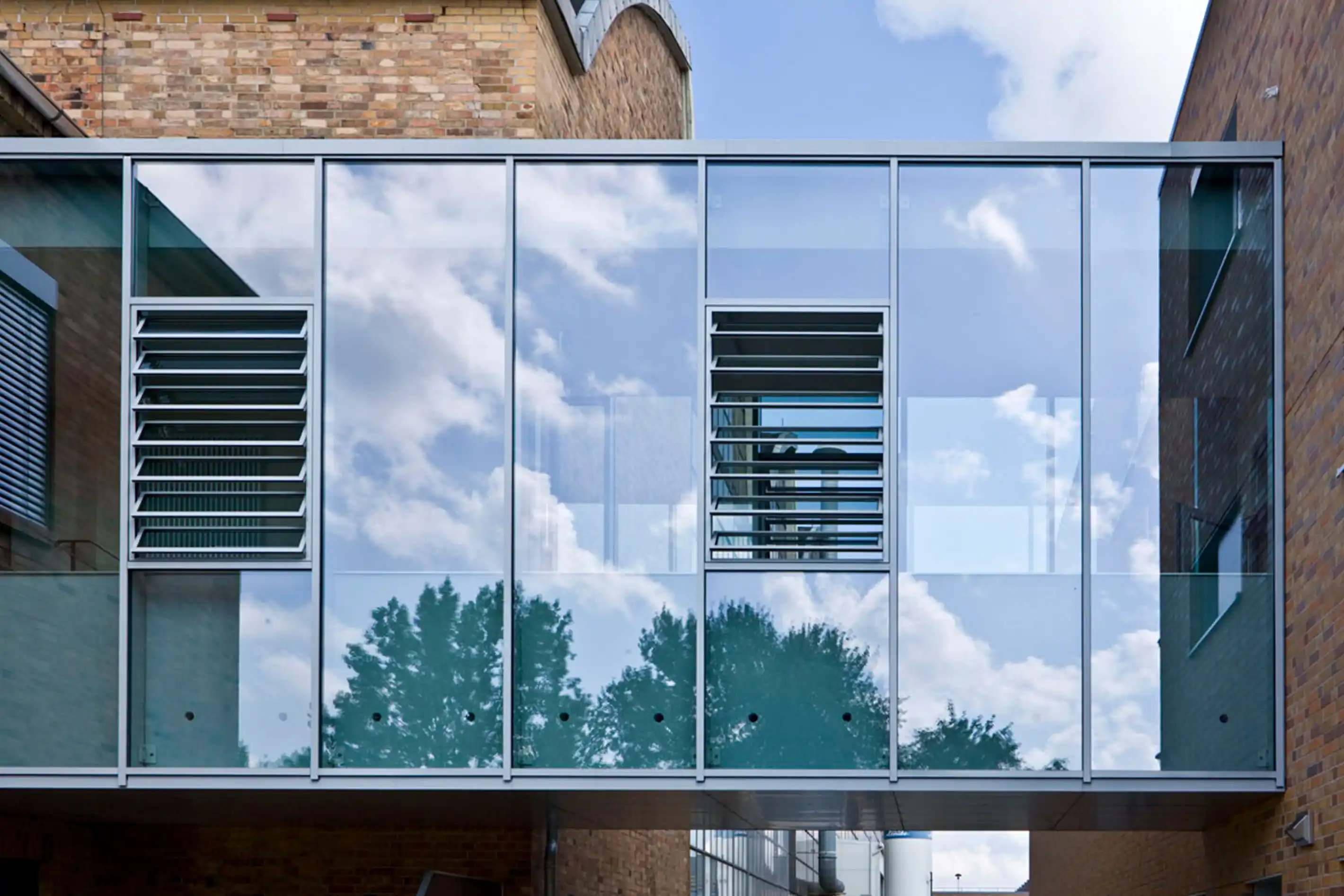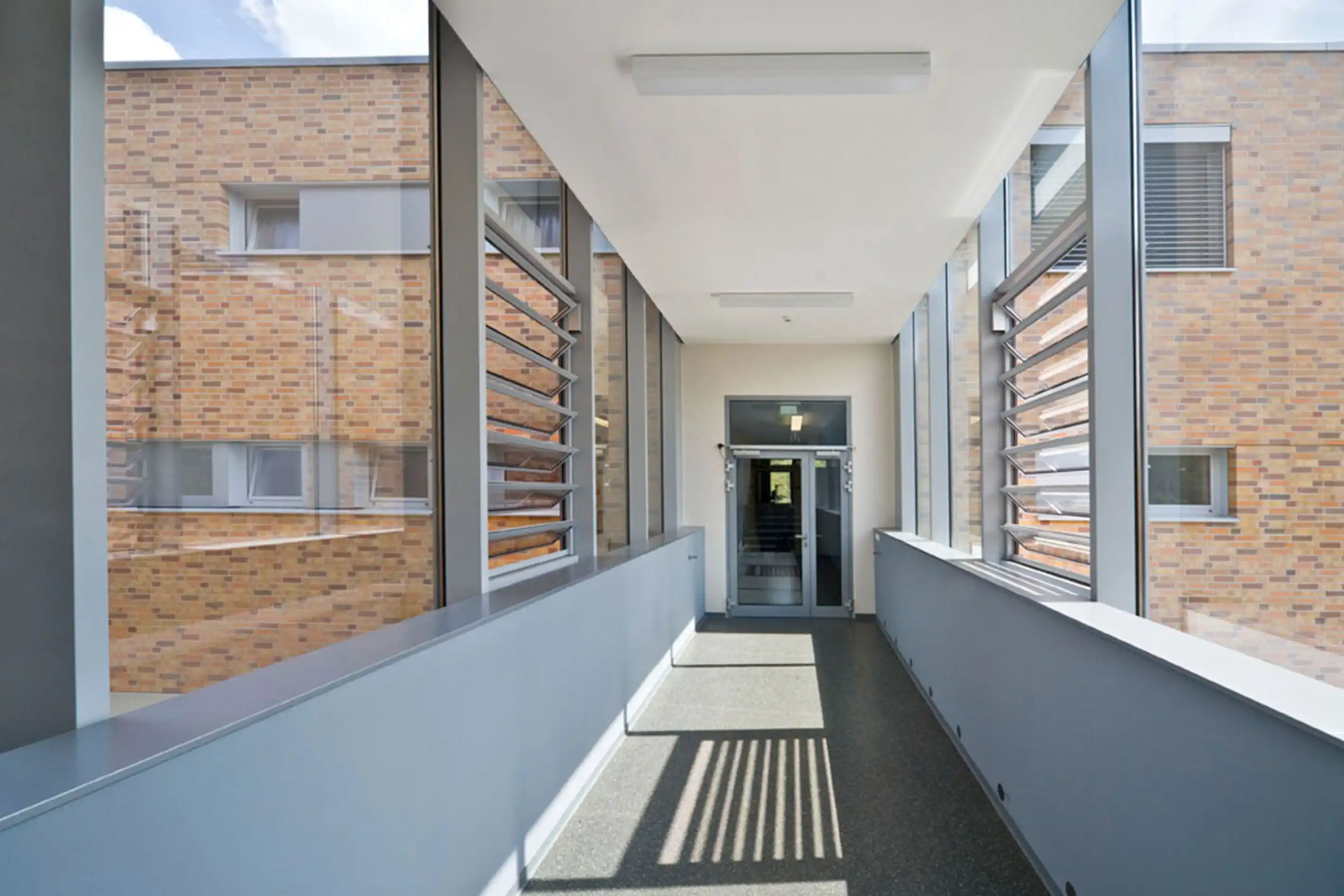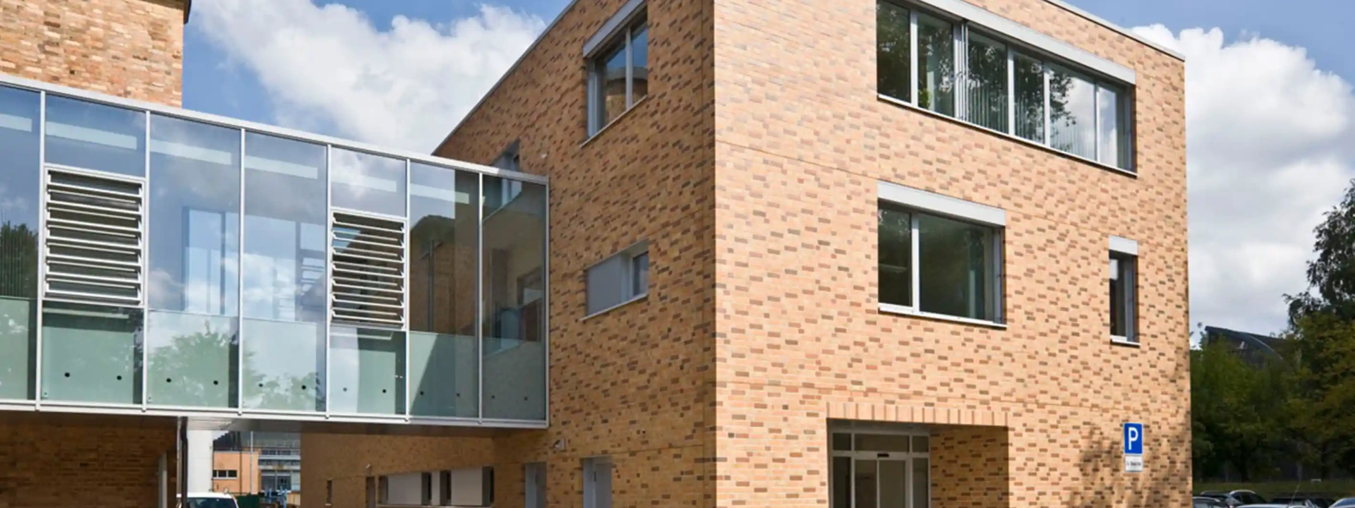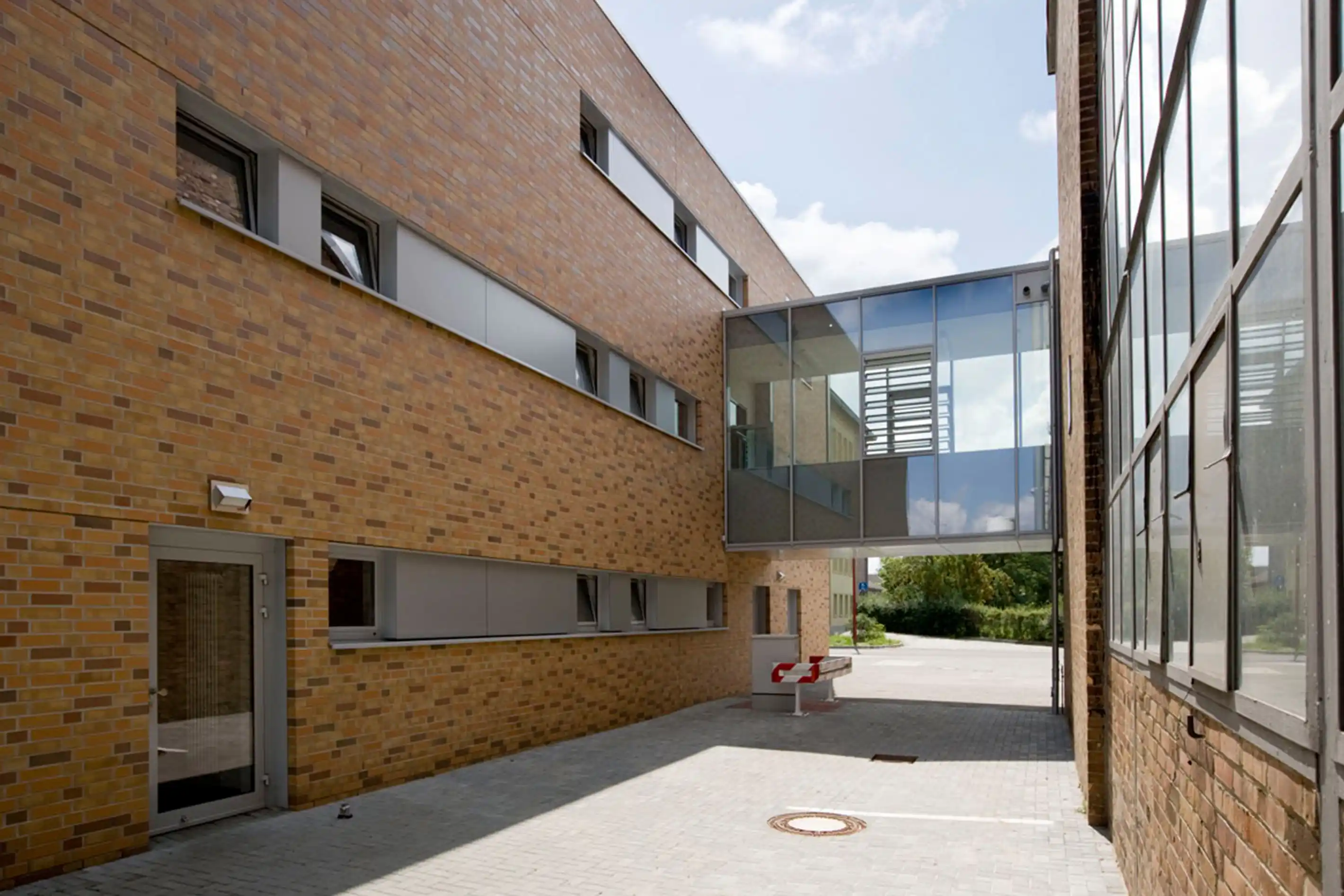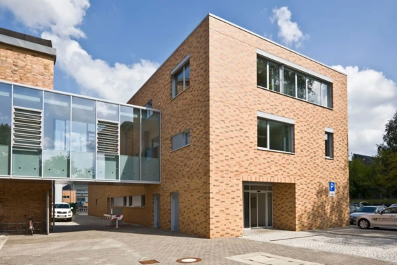 Durch die Wahl eines für den Standort typischen Klinkers als Fassadenmaterial fügt sich das Gebäude hervorragend in die Umgebung ein, die von Klinkerbauten der 50er Jahre geprägt ist. Die Behandlung des Materials, die gewählten Fensterformate, der plastische Gebäudeeinschnitt im Eingangsbereich und die verglaste Verbindungsbrücke zum bestehenden Bürogebäude weisen jedoch deutlich darauf hin, dass es sich um einen zeitgenössischen Bau handelt, der eine eigene Formensprache vertritt.