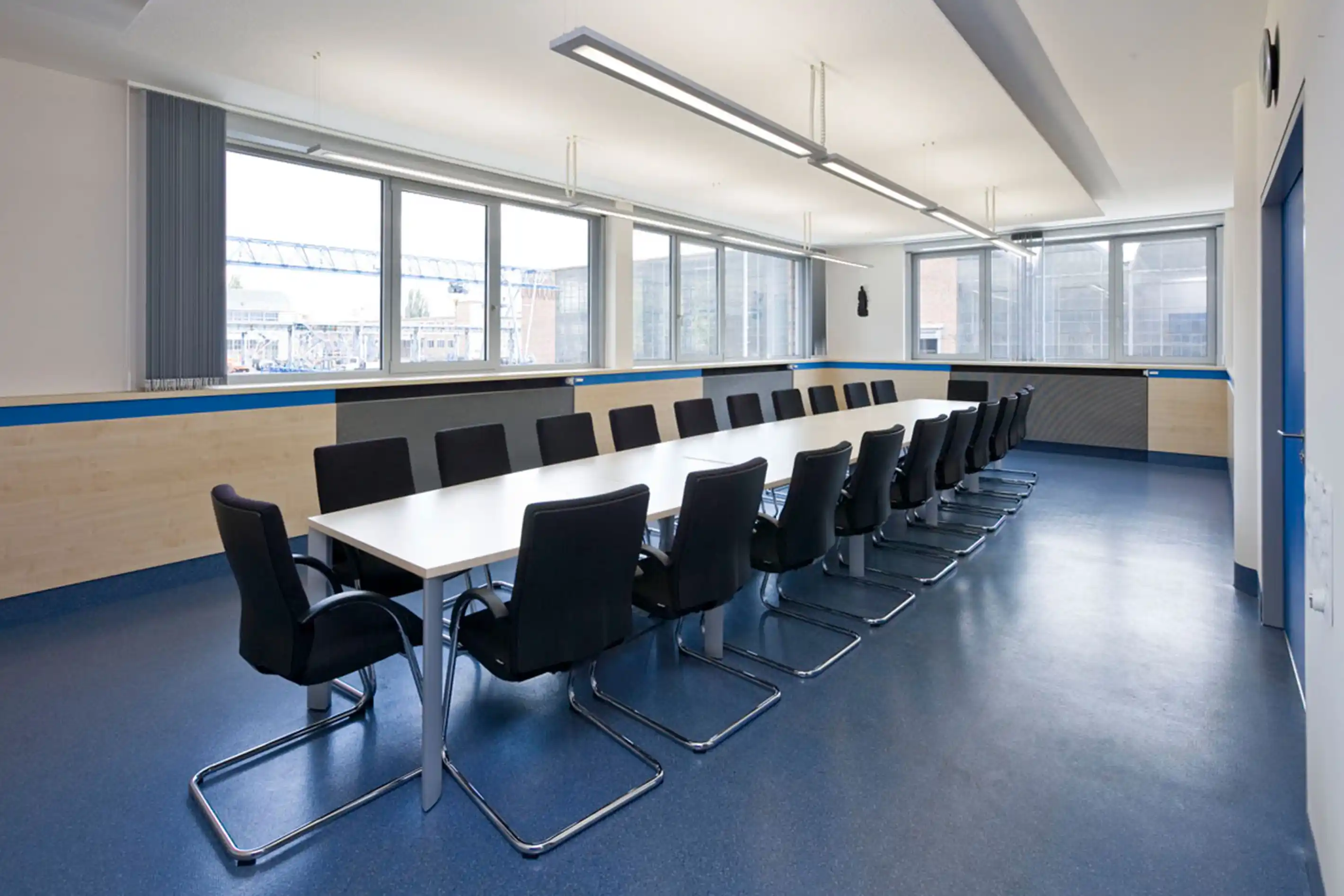 Das Bürogebäude ist für eine Kapazität von ca. 35 Mitarbeitern ausgelegt. Durch die gewählte Lage entsteht eine klare städtebauliche Einordnung, die Freifläche östlich der Halle wird nur im unbedingt erforderlichen Maß beeinträchtigt. Das Gebäude ist als lang gestreckter Bau in Nord-Süd-Richtung entwickelt, die Büroräume sind nach Osten orientiert. Zur bestehenden Werkshallenseite hin befinden sich die Nebenräume sowie die Erschließung. Ein repräsentativer Beratungsraum für 20 Personen ergänzt das Raumangebot.