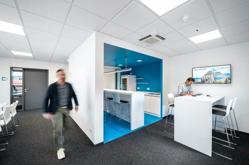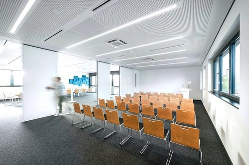 Genauso konsequent wie die Farbgestaltung wurde auch die Beleuchtung mit einer klaren geradlinigen Formsprache und LEDs umgesetzt. Es entstanden Meeting-Points für den Austausch und kleine Beratungen auf interaktiver Ebene. Ein Co-Working-Space mit Plenum, kommunikativen Arbeitstischen, Benefitbereich und Hot-Desk-Vermietung schafft Gründern einen flexiblen Arbeitsraum. Moderne Büroausstattung in Form von Steh- und Sitzarbeitsplätzen sowie die interaktive Technische Ausstattung mit Touch-Panels lassen ein zeitgemäßes Ambiente entstehen.