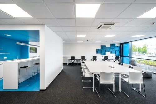 Diesem Geist hatten die Planer von IPROconsult durch die Gestaltung und Gliederung von Bürogebäude und Werkhalle Rechnung zu tragen. Gleichzeitig galt es, die sachlichen und zurückhaltenden Gebäude ansprechend und aufmerksamkeitsstark zu gestalten. So setzte Planer Denny Zeume Akzente durch die Farbgestaltung, die sich als übergeordnetes Gestaltungsprinzip durch beide Gebäude zieht: Ein intensives Blau für die erneuerbaren Energien steht im Kontrast zu Anthrazit, das die Kohle repräsentiert. Weiß hebt das DOCK³ in seiner Umgebung hervor. „Die Farben haben wir gewählt, um Identität zu schaffen“, erklärt Zeume. „Sie werden auch in das Vermarktungskonzept integriert, wo sich ebenfalls der Leitgedanke des Wegs von der Kohle zu den Erneuerbaren durchzieht.“ Fensterbänder, Eingangsbereiche und Laibungen der Einschnitte wurden blau ausgelegt. Diese Akzentfarbe setzt sich im Inneren an den Wänden, Fliesen und Akustikelementen fort. Weiß kam bei der Möblierung, bei Decken und Wänden zum Einsatz; die Böden wurden in Anthrazit gehalten. „Dieses Farbkonzept ist zwar schlicht, wirkt aber durch die konsequente Umsetzung als Highlight“, findet Bauüberwacher Thomas Bauer aus der IPROconsult-Niederlassung Lausitz.