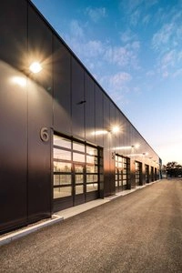 Auch technisch hat das schlichte Projekt einiges zu bieten: So wurde die Basis der Werkhalle als Köcherfundament ausgeführt. Dieses besteht aus einer Stahlbeton-Fundamentplatte und dem aufstehenden Köcher. Der Köcher weist in der Mitte eine ausreichend große Vertiefung zur Aufnahme einer Fertigteilstütze auf. Der zwischen beiden Fertigteilen planmäßig vorgesehene Hohlraum wird nach dem Einsetzen und Ausrichten der Stütze mit Vergussmörtel ausbetoniert, um eine kraftschlüssige und dauerhafte Verbindung zu erzielen. „Auch dieses nicht alltägliche Detail haben wir gleich in 3D mit der Software Sofistik geplant“, berichtet Artem Fesenko, Tragwerksplaner aus Leipzig. Eine weitere Herausforderung kam auf Ralf Sonntag zu, der die vielen Zufahrten zur Halle befestigen und den Schlagregen ableiten musste: „Hier standen sich die hohen zu erwartenden Radlasten beim Befahren der Toreinfahrten und die Vorgaben der Energie-Einsparverordnung bezüglich Dämmungen im Fundament-und Bodenplattenbereich gegenseitig im Wege. Eine Entwässerungsrinne konnte nicht eingebaut werden, deshalb mussten wir auf Gefälle und eher ungewöhnliche Befestigungsarten in den Zufahrten setzen.“